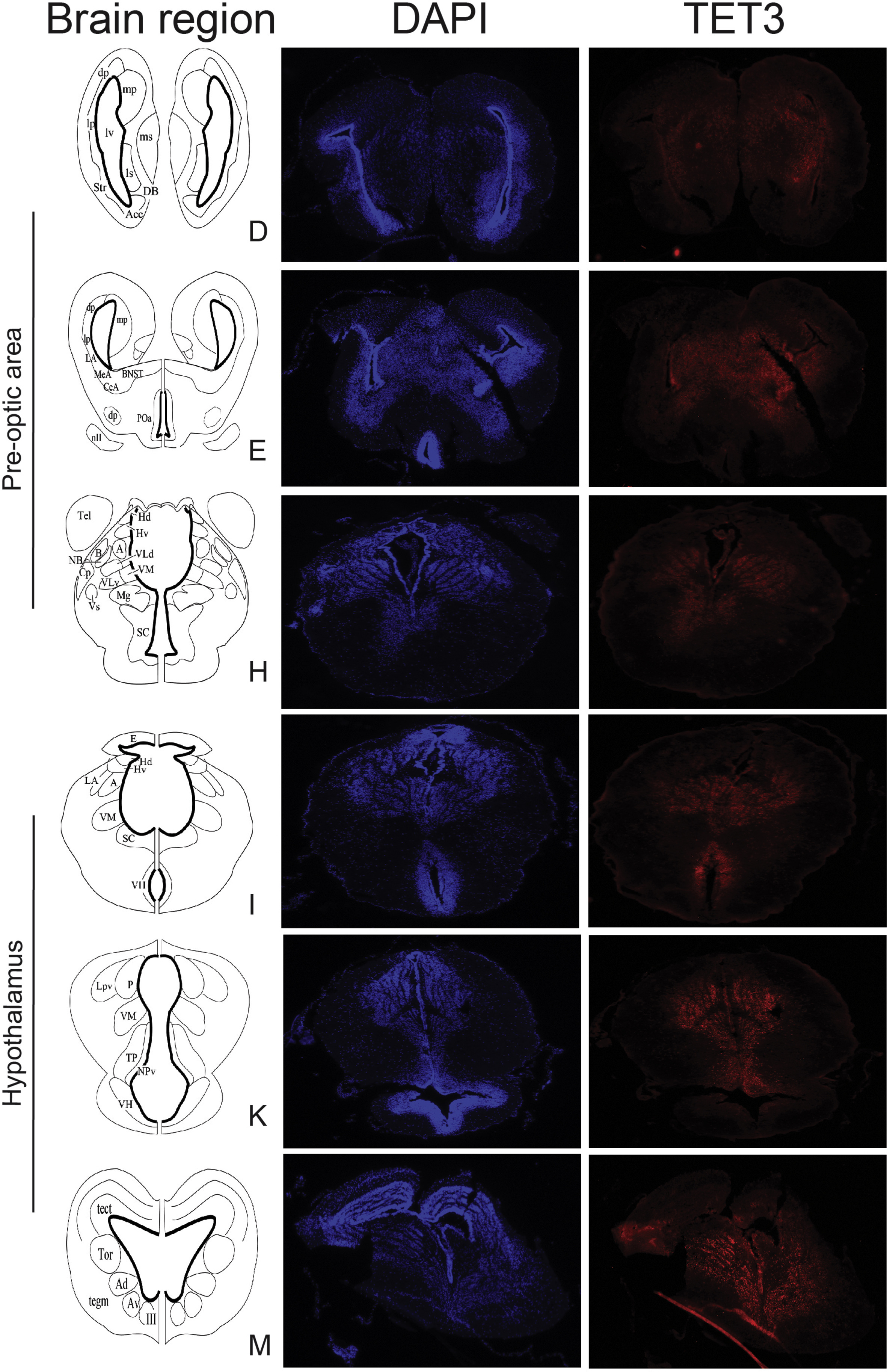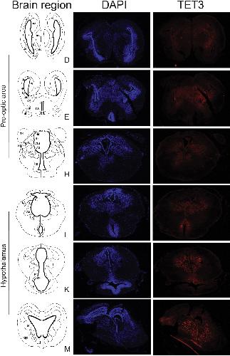 Supplemental Fig. 20. Distribution of TET3 immunoreactivity in X. tropicalis brain at metamorphic climax. We conducted immunohistochemistry for TET3 on 16 µm transverse sections of NF stage 62 X. tropicalis brain. Shown are representative images taken at 4X magnification; we analyzed three brains with similar results. Letters next to schematic diagrams represent the corresponding brain regions shown in Supplemental Fig 17. |