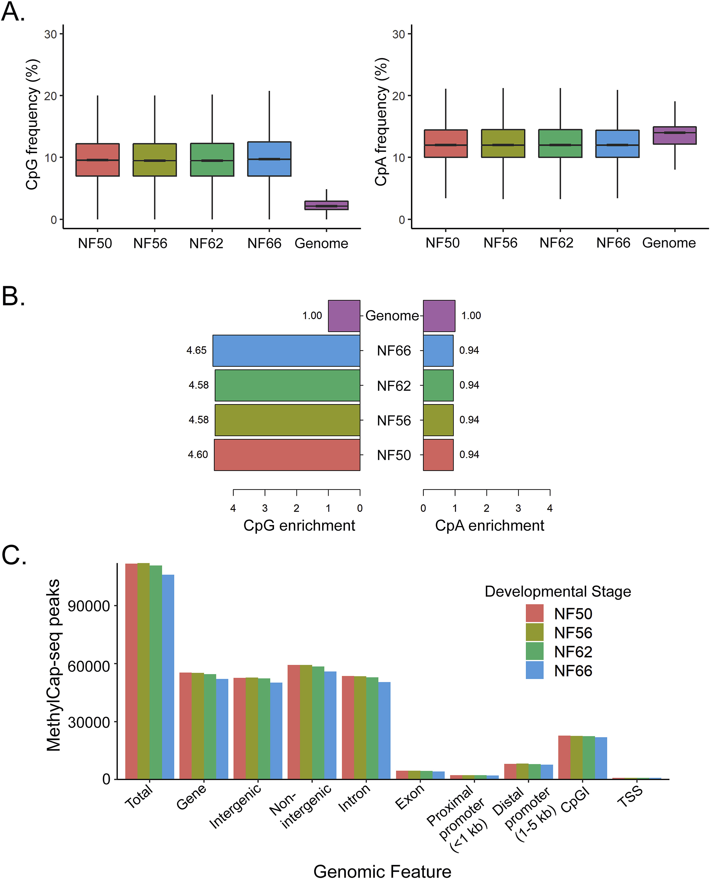 Fig. 1. Genome-wide patterns of DNA methylation in tadpole brain during metamorphosis analyzed by MethylCap-seq. We conducted MethylCap-seq on DNA isolated from X. tropicalis tadpole brain (preoptic area/thalamus/hypothalamus) at four stages of metamorphosis (n â= â3 per stage). A. CpG dinucleotides (left panel) are enriched at MethylCap-seq peaks at each stage of development, while CpA dinucleotides (right panel) are not. Shown are plots of the peak CpG (left panel) and CpA (right panel) frequencies for each stage of metamorphosis (NF - Nieuwkoop-Faber). The CpG and CpA frequency values were binned (50 bins) prior to plotting. B. The mean number of total MethylCap-seq peaks across the genome, and peaks found within genes (presented by gene region or feature; 50% or more of the peak had to occur within the gene region or feature to be counted) at four stages of metamorphosis. C. The number of MethylCap-seq peaks and their distribution between different regions of the genome did not differ between developmental stages. Gene refers to the gene-body, which we defined as the region from the first exon through the last exon. The promoter region was defined as 5 âkb upstream from the end of the first exon (i.e., it included the first exon). Intergenic refers to regions not within any gene-body, and non-intergenic is regions within a gene body. CpG islands are regions identified by the UCSC genome browser. |
