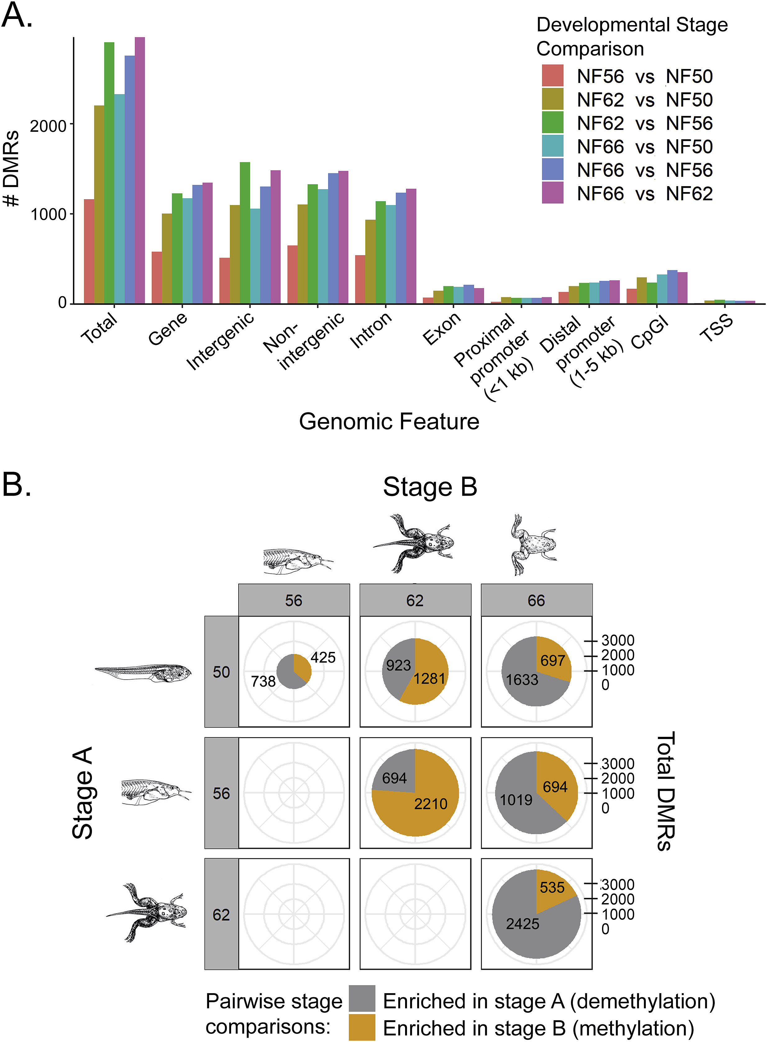 Fig. 2. Changes in DNA methylation in tadpole brain during metamorphosis analyzed by MethylCap-seq. We conducted MethylCap-seq on DNA isolated from X. tropicalis tadpole brain (preoptic area/thalamus/hypothalamus) at four stages of metamorphosis (n â= â3 per stage). A. Shown is the distribution of DMRs among different genomic features during metamorphosis. Gene refers to the gene-body, which we defined as the region from the first to the last exon. The promoter region was defined as 5 âkb upstream of the first exon through the first exon. Intergenic refers to regions not within a gene or gene promoter region. CpG islands are regions identified by the UCSC genome browser. Approximately half of the DMRs occurred within or proximal to genes, the other half were intergenic. Most of the DMRs found within genes were in introns. There were no differences between developmental stages in the distribution of DMRs across the genome. B. Shown in the pie charts are the numbers of differentially methylated regions (DMRs) and the direction of change in DNA methylation (increase is gray, decrease is yellow) within each pairwise comparison (stage A vs. stage B). The number of DMRs in each category is also given. The total number of DMRs increased during metamorphosis. In the first comparison (NF stage 50 vs. 56; pre-metamorphosis to early pro-metamorphosis) there was greater demethylation, in the second (NF stage 56 vs. 62; late pro-metamorphosis to metamorphic climax) greater methylation, and in the third (NF stage 62 vs. 66; metamorphic climax to the completion of metamorphosis) greater demethylation. Comparison of methylation changes from pre-metamorphosis (NF stage 50) to the completion of metamorphosis (NF stage 66) showed that DNA demethylation predominated. |