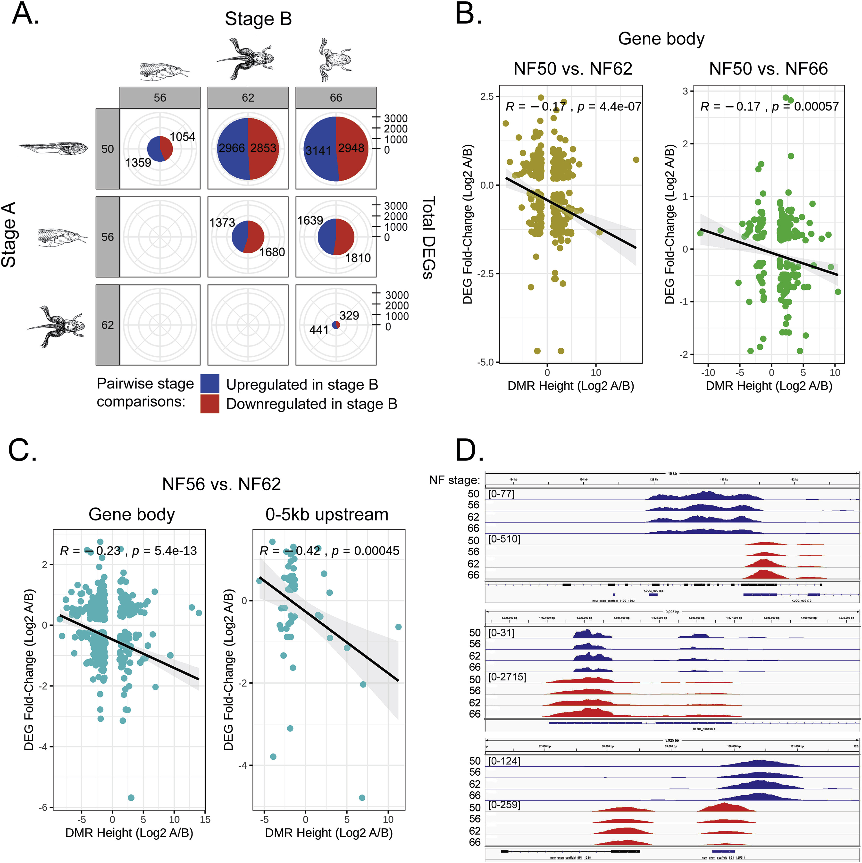 Fig. 3. Gene expression changes in X. tropicalis tadpole brain during metamorphosis analyzed by RNA-seq and their relationship to changes in DNA methylation analyzed by MethylCap-seq. We conducted RNA-seq on total RNA isolated from X. tropicalis tadpole brain (preoptic area/thalamus/hypothalamus) at four stages of metamorphosis (n â= â3 per stage). We used DESeq software to identify genes whose mRNA levels changed during metamorphosis (differentially expressed genes - DEGs). A. Shown are pie charts with pairwise comparisons among the four stages of metamorphosis of DEGs. The numbers in the red areas of the pie charts represent genes upregulated in Stage B, while the numbers in the blue areas of the pie charts represent genes downregulated in Stage B. Gene regulations changes increased as metamorphosis proceeded, with roughly half the genes upregulated and half downregulated. B. Correlation between overlapping DMRs and DEGs by direction and magnitude of change within gene bodies comparing pre-metamorphosis (NF 50) with metamorphic climax (NF 62) and pre-metamorphosis and the completion of metamorphosis (NF 66). Shown are scatter plots, Pearson correlation coefficients, and p-values for each comparison, with DEG fold-change on the y-axis and differentially methylated region (DMR) height on the x-axis (Log2A/B, where A is NF 62 or 66 and B is NF 50). The values were plotted and a regression line was fit (black line). A 95% Confidence Interval (light-gray region) is also shown around the regression line. There were no statistically significant correlations for these comparisons in the region 5 âkb upstream of the transcription start site (TSS; data not shown). C. Correlation between overlapping DMRs and DEGs by direction and magnitude of change within gene bodies and at 5 âkb upstream of TSSs comparing pro-metamorphosis (NF 56) with metamorphic climax (NF 62). D. Three examples of a negative correlation between DNA methylation and gene transcription in tadpole brain during metamorphosis (top and middle panels: DNA demethylation; bottom panel: DNA methylation). Shown are screenshots of MethylCap-seq (blue) and RNA-seq (red) reads at discrete genomic regions at four stages of metamorphosis. Reads were mapped to the reference genome using the UCSD Genome Browser. NF stage â Nieuwkoop-Faber developmental stage. Numbers in brackets represent the peak height range. Gene IDs and symbols: (top) XLOC_002166; unknown, (middle) XLOC_030199.1; avpr1a, (bottom) new_exon_scaffold_851_1255.1; unknown. |