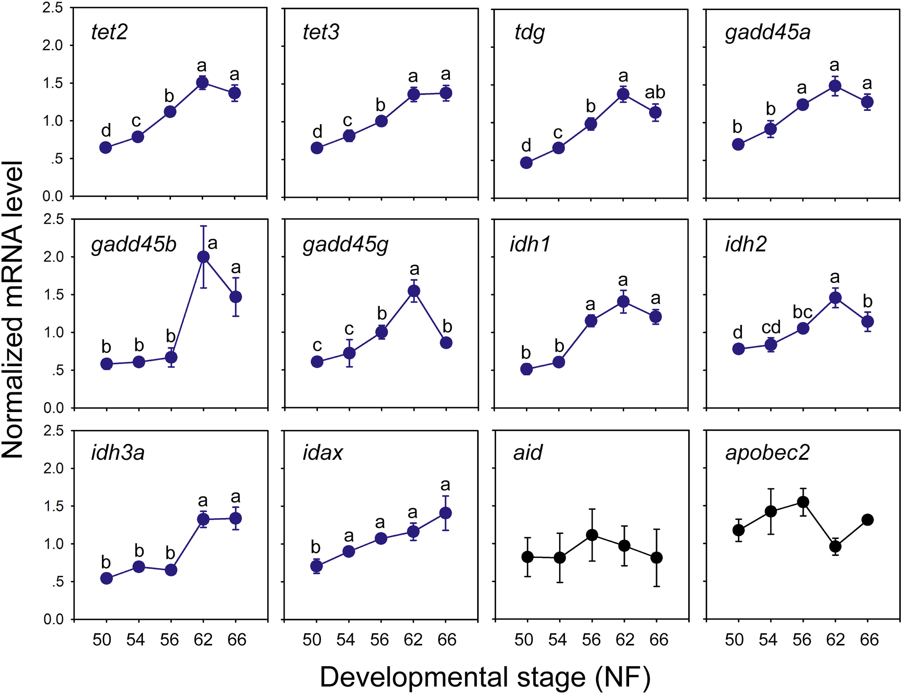 Fig. 5. The mRNAs for genes that code for enzymes involved with active DNA demethylation increase during metamorphosis in tadpole brain. We analyzed mRNA levels using RTqPCR in the region of the preoptic area/thalamus/hypothalamus of X. tropicalis tadpole brain at different stages. All mRNAs were normalized to the reference gene alpha-actinin mRNA which did not change during development (data not shown). Points represent the means â± âSEM (n â= â5/developmental stage). All genes, except aid and apobec2 showed statistically significant increases during metamorphosis (p â< â0.05, ANOVA). |