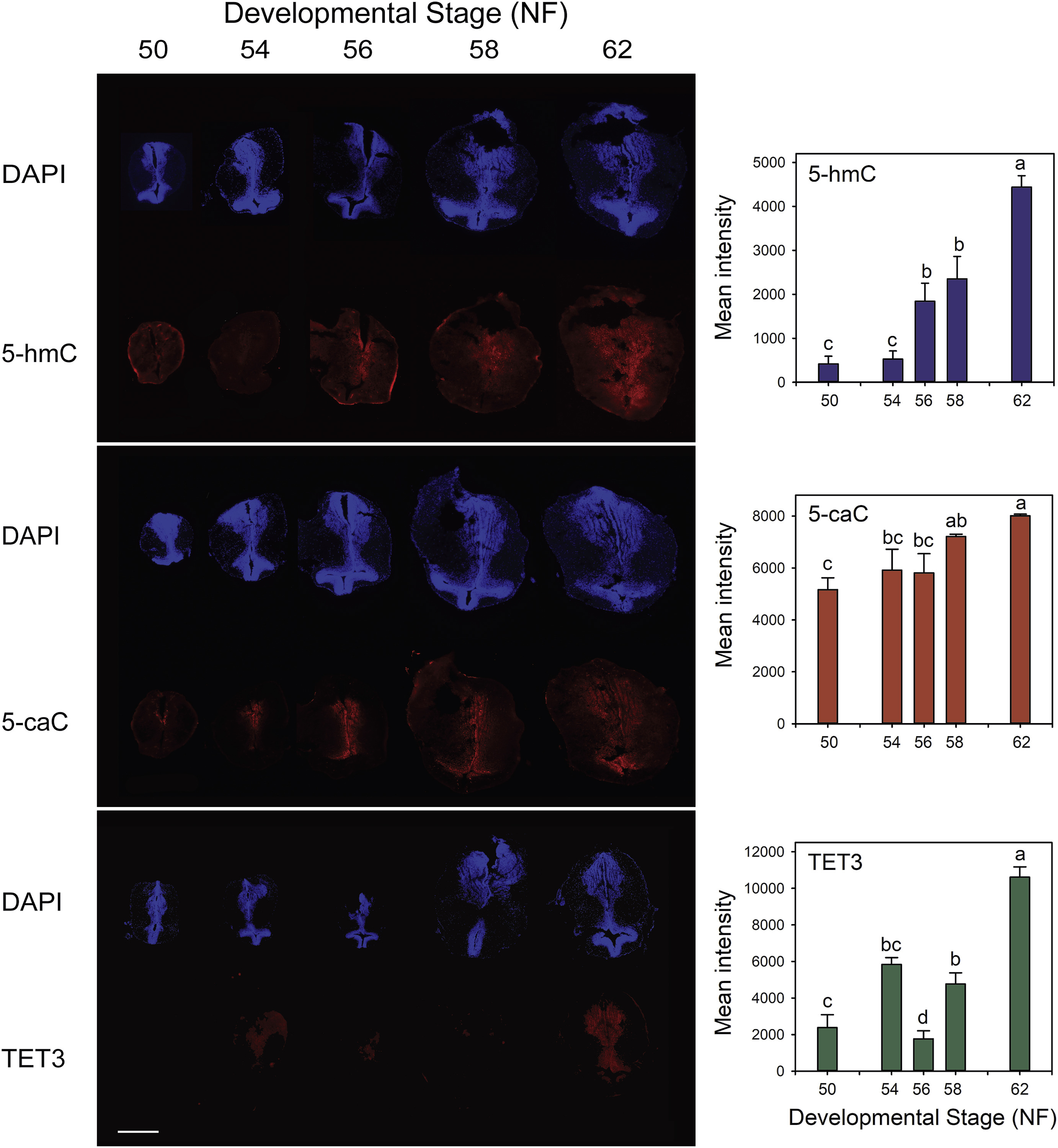 Fig. 6. Immunoreactivity for 5-hmC, 5-caC and TET3 increases in tadpole brain during spontaneous metamorphosis. We conducted immunohistochemistry on the region of the tadpole brain containing the thalamic nuclei and ventral hypothalamus (section K in Supplemental Fig. 17; abbreviations are defined in Supplemental Table 5) at different stages of metamorphosis. Shown are representative brain sections stained with DAPI and with antibodies to the three different antigens, captured at 4X magnification. Scale bar â= â0.5 âmm. Graphs to the right of the brain images provide quantification of the immunoreactivity. Bars represent the means â± âSEM (n â= â4/developmental stage). Data were analyzed by one-way ANOVA (p â< â0.001). Letters indicate results of the post-hoc test (Fishersâs LSD); means with the same letter are not significantly different (p â< â0.05). |