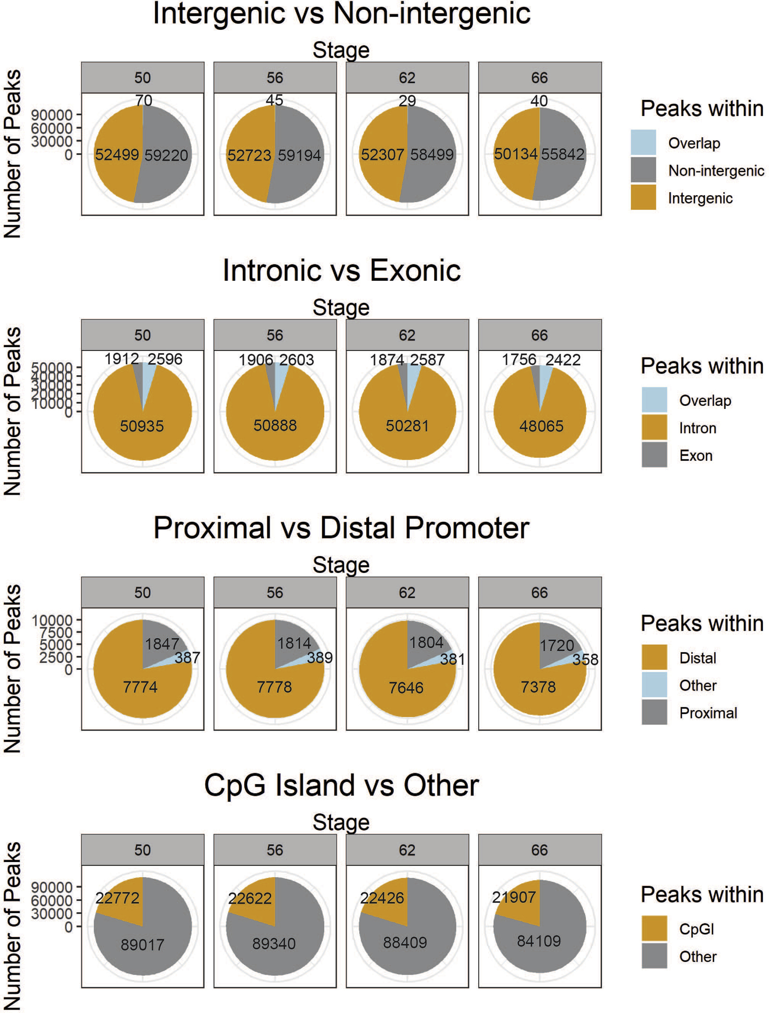 Supplemental Fig. 2. MethylCap-seq peak distribution in relation to specific genomic features. Shown are the numbers and relative proportions of intergenic vs intragenic, exonic vs intronic, promoter vs non-promoter, and CpG island vs non-CpG island peaks at each stage of metamorphosis. For all pie charts, the area of the pie chart reflects the total number of peaks identified. The numbers of peaks within each category is also given. Peaks were selected if ≥ 50% of the peak was within the genomic feature. For the intergenic vs. intragenic and the exonic vs. intronic comparisons, rounding led to some peaks not being counted, and these are labelled as “Other”. We did not see any differences in the relative distribution of peak locations between stages of metamorphosis. |