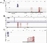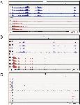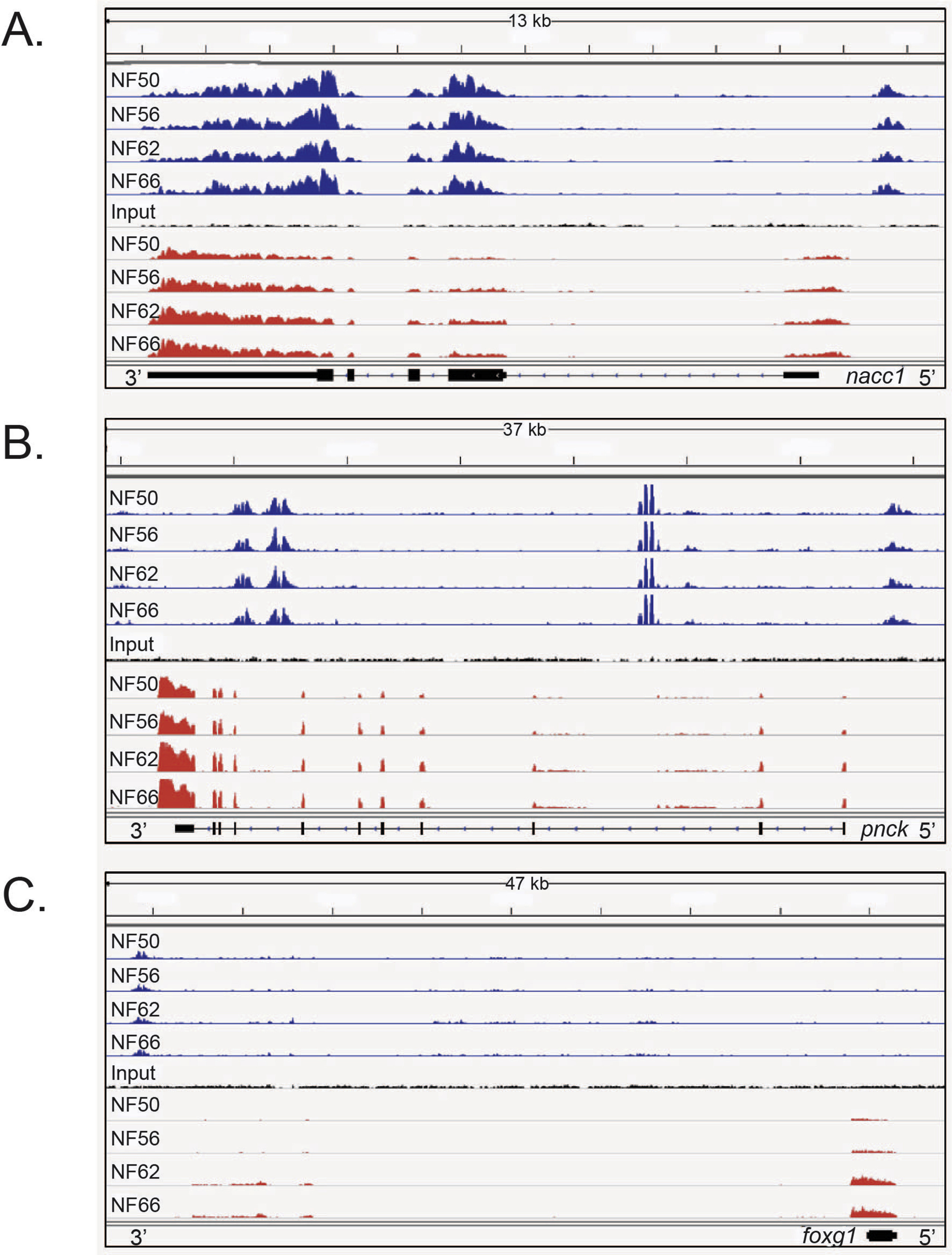 Supplemental Fig. 4. Representative methylation profiles in the X. tropicalis genome found by MethylCap-seq. Shown are IGV genome browser tracks for MethylCap-seq and RNA-seq reads at three loci of the X. tropicalis genome at four stages of metamorphosis (NF â Nieuwkoop-Faber). A. The nacc1 locus exhibited heavy methylation within exons and at an upstream region. B. The pnck locus exhibited methylation within introns and at an upstream region. C. The foxg1 locus exhibited no significant methylation. |