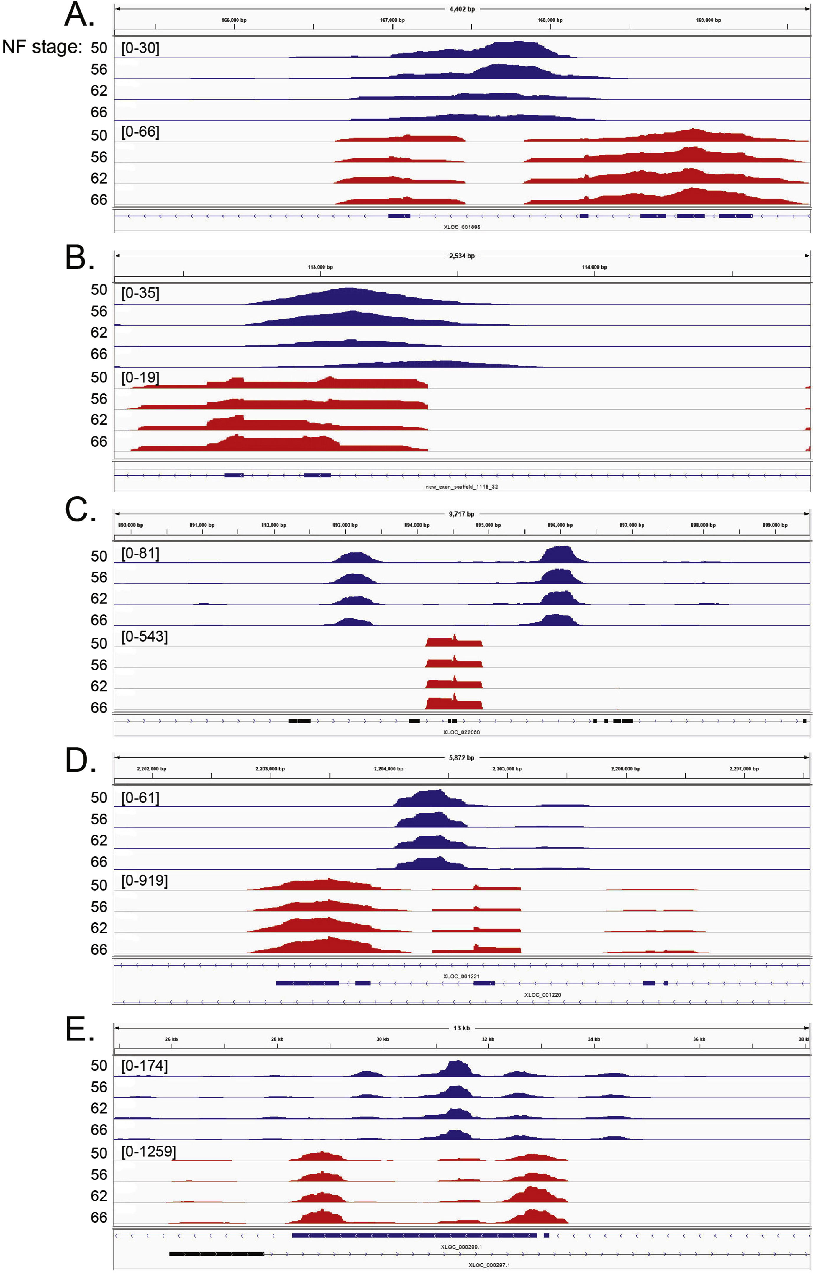Supplemental Fig. 5. Five examples of the negative correlation between DNA methylation and gene transcription in tadpole brain during metamorphosis. Shown are screenshots of MethylCap-seq (blue) and RNA-seq (red) reads at discrete genomic regions at four stages of metamorphosis. Reads were mapped to the reference genome using the UCSD Genome Browser. NF stage â Nieuwkoop-Faber developmental stage. Numbers in brackets represent the peak height range. Gene IDs and symbols: (A) XLOC_001695; exd3, (B) new_exon_scaffold_1148_32; clasp1, (C) XLOC_022068; traf3, (D) XLOC_001221; msra.2, and (E) XLOC_000299.1; hipk3. |