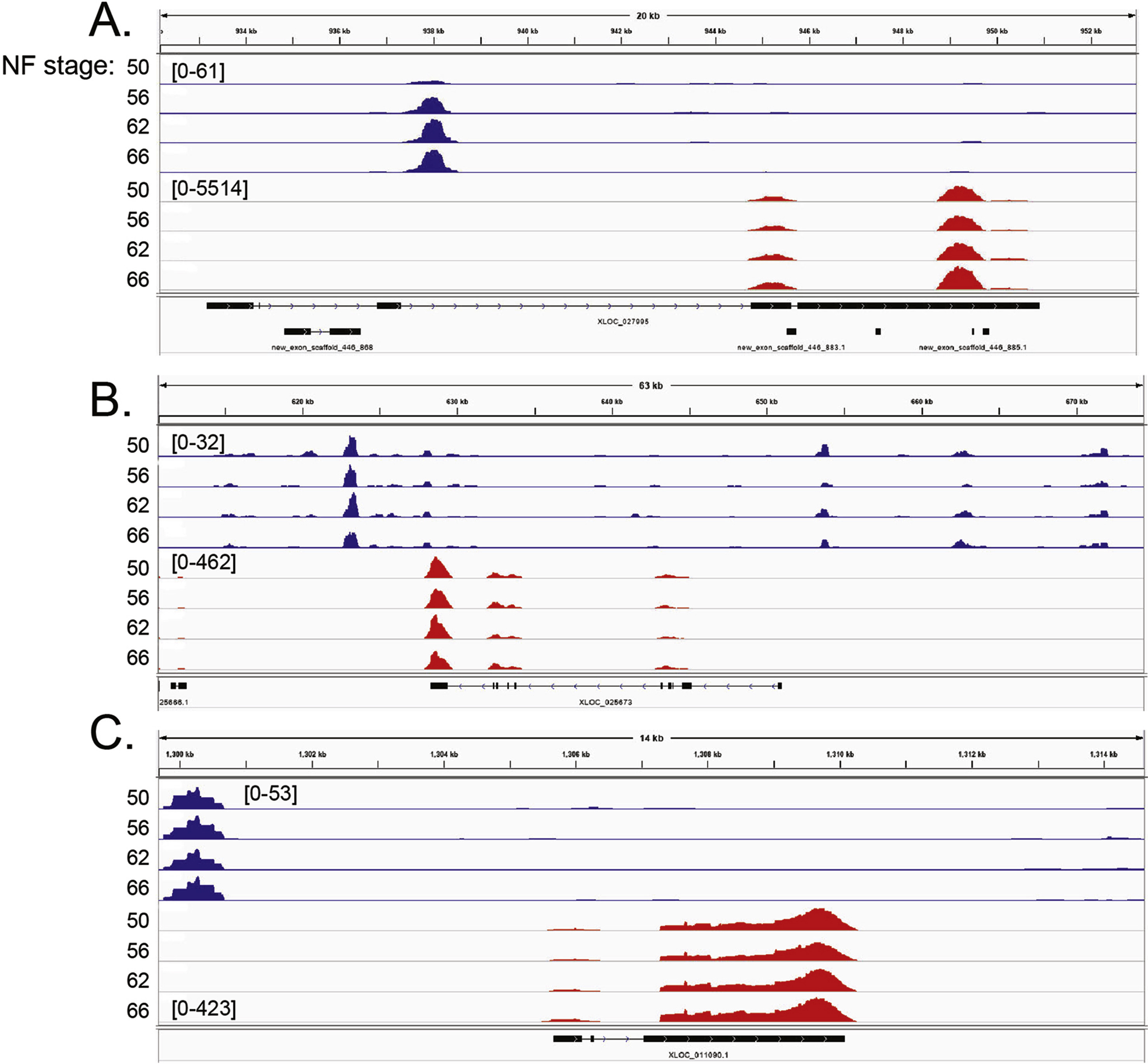 Supplemental Fig. 6. One example of a positive correlation between DNA methylation and gene transcription (A), and two examples (B, C) of a lack of correlation between DNA methylation and gene transcription in tadpole brain during metamorphosis. Shown are screenshots of MethylCap-seq (blue) and RNA-seq (red) reads at discrete genomic regions at four stages of metamorphosis. Reads were mapped to the reference genome using the UCSD Genome Browser. NF stage â Nieuwkoop-Faber developmental stage. Numbers in brackets represent the peak height range. Gene IDs and symbols: (A) XLOC_027995; igfbp5, (B) XLOC_025673; pax6, (C) XLOC_011090.1; sox9. |
