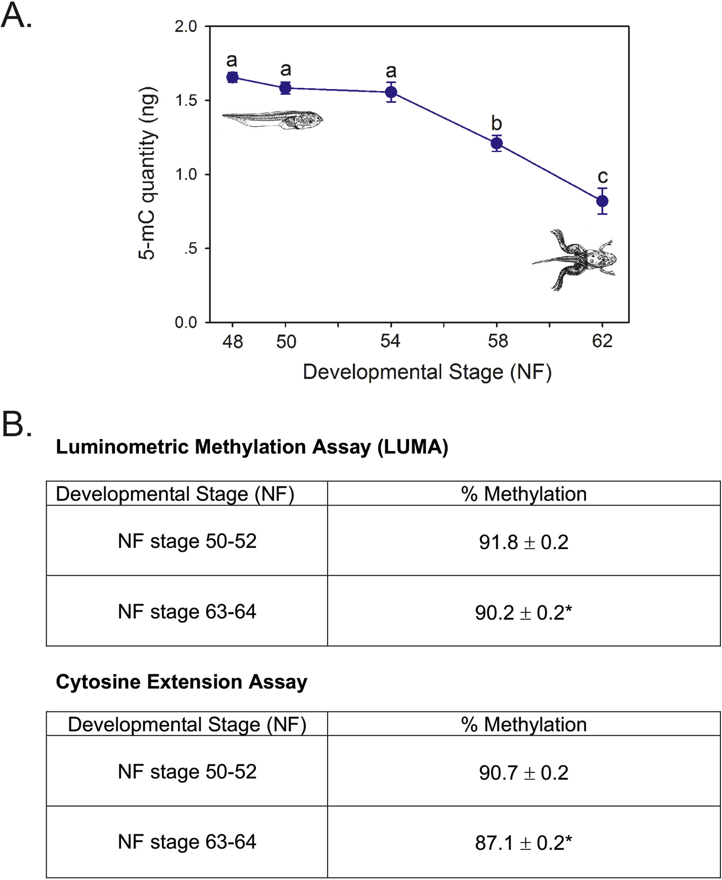 Supplemental Fig. 7. The abundance of 5-methylcytosine (5-mC) declines in the genome of Xenopus laevis tadpole brain during metamorphosis. A. We extracted DNA from the preoptic area/thalamus/hypothalamus (see Supplemental Fig. 1) of X. laevis tadpole brain at five stages during metamorphosis (NF â Nieuwkoop-Faber) and measured 5-mC abundance using enzyme-linked immunosorbent assay (EIA). Points represent the means ± SEM (n=5 per developmental stage); means with the same letter are not significantly different (F(4,20) = 36.096, p < 0.001; ANOVA). B. The genome of Xenopus tadpole neural cells undergo demethylation during metamorphosis, as evidenced by two independent assays, Luminometric Methylation Assay (LUMA) and Cytosine Extension Assay. We extracted genomic DNA from the whole brain of premetamorphic (NF stage 50-52) and metamorphic climax stage (NF stage 63-64) X. laevis tadpoles. We digested the DNA with HpaII and MspI, which are isoschizomers that recognize 5â â CCGG- 3â, then conducted either LUMA or Cytosine Extension Assay (see Supplemental Materials and Methods). The numbers shown are the mean ± SEM (n=5/ developmental stage) of the percentage of methylated CpG dinucleotides found within the HpaII/MspI restriction sites at the two stages of metamorphosis. * p<0.05, Studentâs unpaired t-test. For these two biochemical assays, the percentage difference between premetamorphosis and metamorphic climax stages was small. However, this may be an underestimate, as these two assays can only detect changes at MspI/HpaII restriction sites (âCCGGâ) and are therefore blind to any potential CpH methylation changes. |