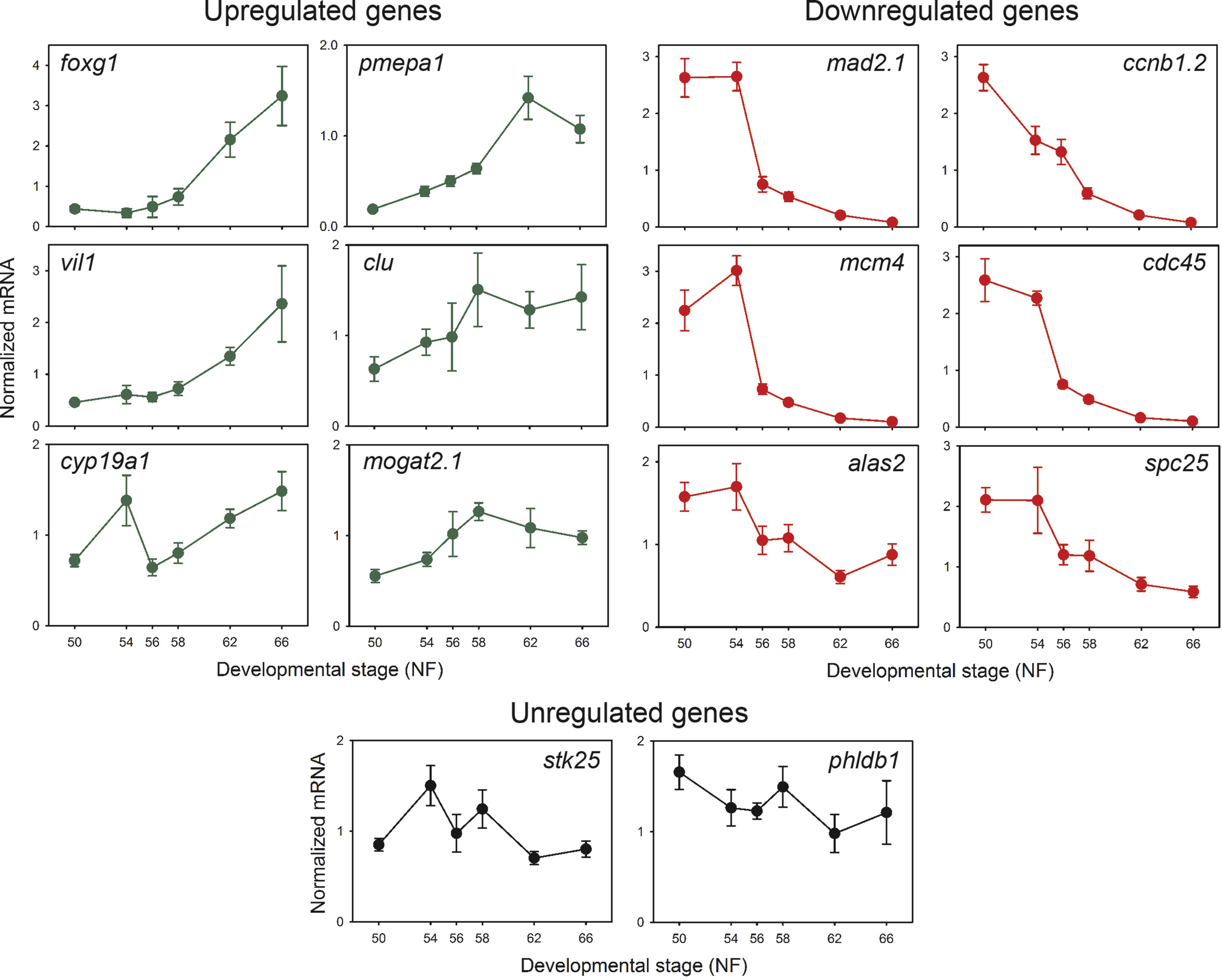Supplemental Fig. 11. Validation of RNA-seq using RTqPCR of genes identified as differentially regulated during metamorphosis in X. tropicalis tadpole brain. Shown are the means+SEM (n=6/developmental stage). |