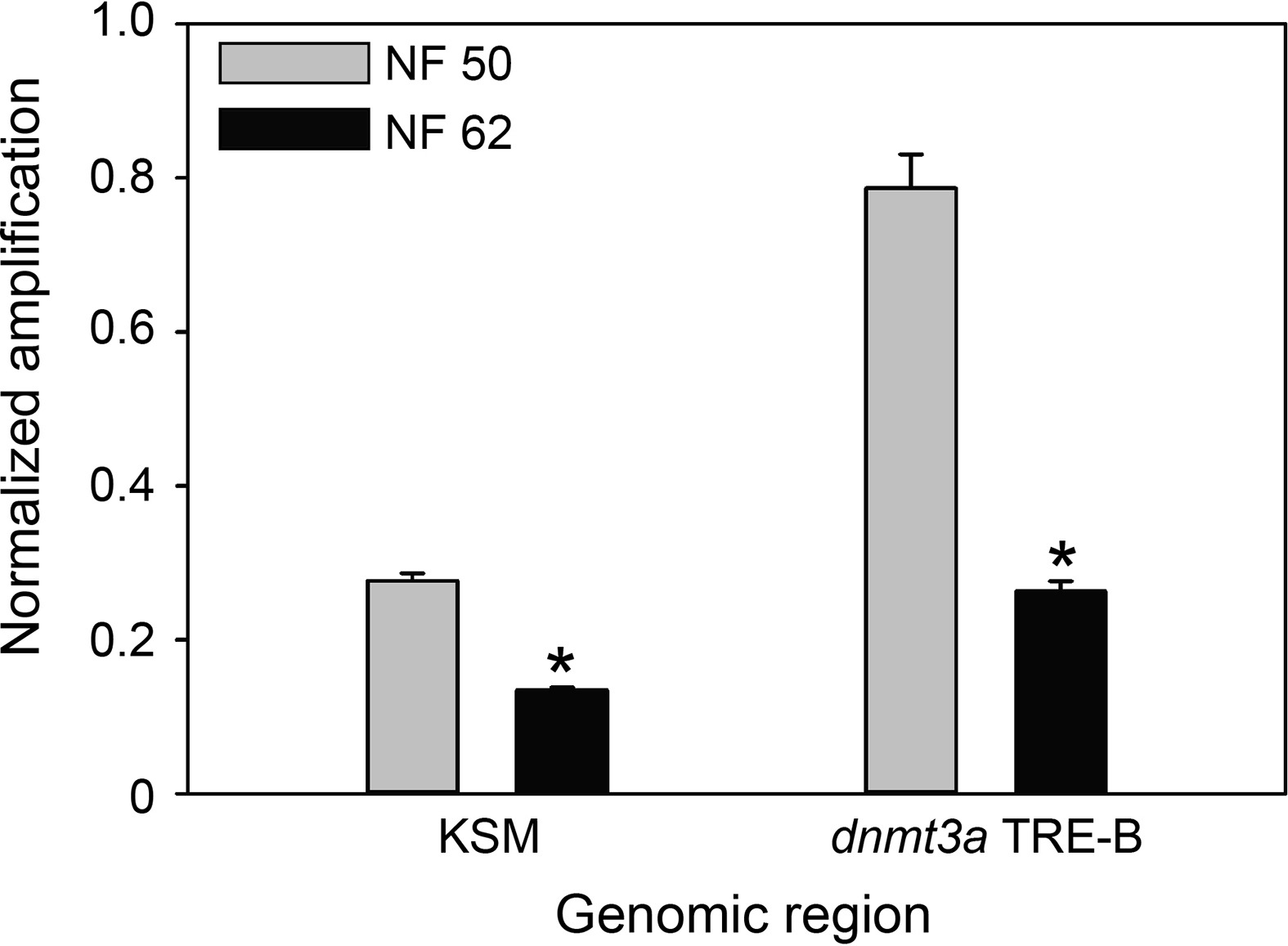 Supplemental Fig. 15. Regions of the X. laevis klf9 and dnmt3a genes that contain thyroid hormone response elements (TREs; and are homologous to X. tropicalis) become demethylated during metamorphosis. We conducted 5-mC chop-qPCR on genomic DNA isolated from whole brains of X. laevis tadpoles at NF stages 50 and 62 (premetamorphosis and metamorphic climax) targeting the KSM and the dnmt3a TRE-B. Bars represent the mean+SEM (n=5/developmental stage) of the normalized PCR amplification signal (normalized to the quantity of the amplicon from a neighboring genomic region that did not contain restriction sites). Asterisks indicate statistically significant differences between developmental stages (KSM: p < 0.001; dnmt3a TRE-B: p < 0.001; Studentâs unpaired t-test). |