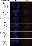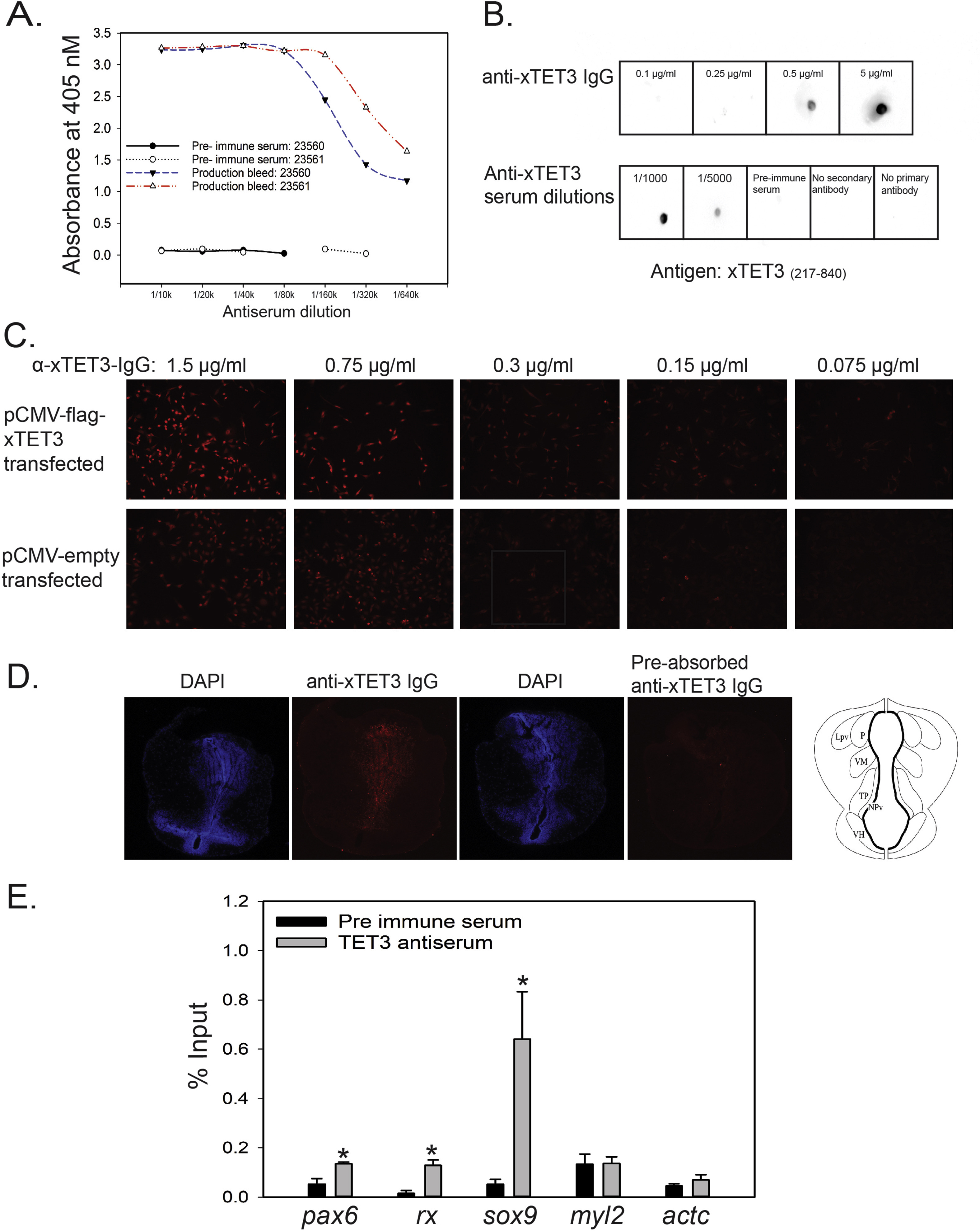 Supplemental Fig. 16. Validation of an in-house generated rabbit antiserum to Xenopus TET3 (xTET3). A. The presence of antibodies to xTET3 was confirmed using enzyme linked immunosorbent assay (EIA). Shown is the absorbance measured at 405 nm dilutions of anti-xTET3 or preimmune serum (rabbit numbers 23560 and 23561). B. Protein A-purified anti-xTET3 IgG or straight anti-xTET3 serum detect recombinant xTET3 using dot blot. We applied 1.5 µg of purified, recombinant xTET3 protein (amino acids 217-840, expressed in E. coli) to nitrocellulose membrane, and incubated the membrane with varying amounts of anti-xTET3 IgG or straight anti-xTET3 serum, or with pre-immune serum. We also included controls in which the primary and secondary antibodies were excluded from the reaction. C. Analysis of TET3 immunoreactivity in the X. laevis myoblast cell line XLT-15 overexpressing TET3. We transfected XLT-15 cells with 1 µg of the expression vector pCMV-flag-xTET3 or empty pCMV plasmid. Cells were fixed, and slides incubated with different concentrations of anti-xTET3 IgG before image capture. D. We tested the specificity of our anti-xTET3 serum by preabsorbing the antiserum with purified, recombinant xTET3 protein (amino acids 217-840, expressed in E. coli) before conducting immunohistochemistry on X. tropicalis tadpole brain. Shown are representative images (n=3 brains; we saw similar results with each brain) of slides from NF stage 58 tadpole brain stained with DAPI and anti-xTET3; the region containing the ventral hypothalamus and thalamic nuclei is shown (a neuroanatomical diagram is at the right, which corresponds to section K in Supplemental Fig. 17) [1]. Adjacent sections from the same tadpole brain were incubated with 0.75 µg/mL anti-xTET3 IgG (left), or with the same amount of anti-xTET3 IgG that had been pre-absorbed with 100 µg/mL recombinant xTET3 protein (right). Pre-absorption of the antiserum eliminated the TET3 immunoreactivity. E. Characterization of our anti-xTET3 serum using ChIP assay. We conducted targeted ChIP assays using straight anti-xTET3 serum or preimmune serum on chromatin extracted from whole NF stage 19 X. laevis embryos. We used qPCR to analyze the promoter regions of sox9, rx and pax6 (three genes for which TET3 association in chromatin has been shown in X. laevis embryos) and actc and myl2 (two negative control regions with no TET3 association) [3]. Bars represent the mean+ SEM (n=4). Asterisks indicate statistically significant differences between the antiserum and pre-immune serum (p<0.05; Studentâs unpaired t-test). |