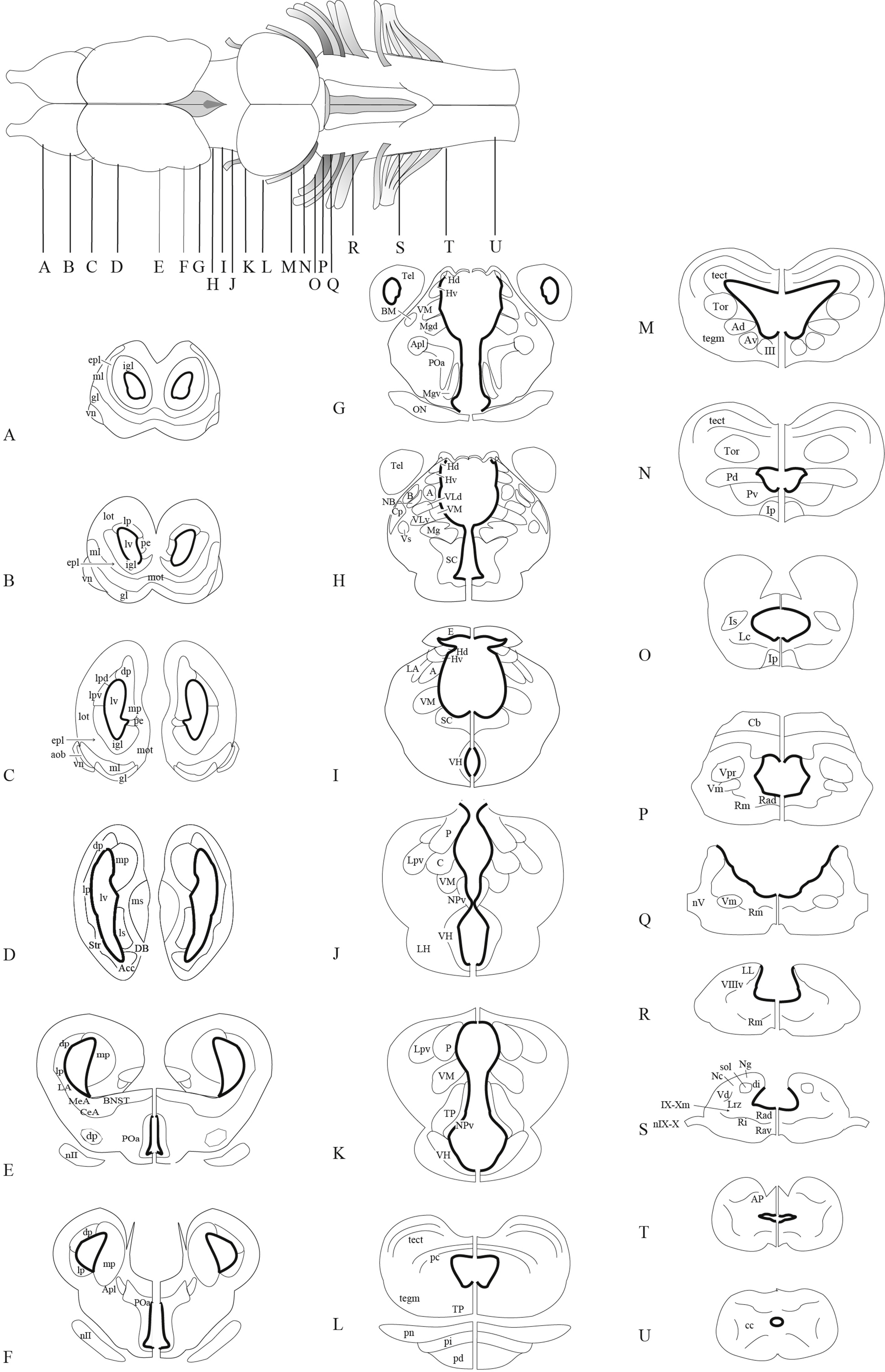 Supplemental Fig. 17. Schematic coronal illustration of Xenopus brain. The top figure is a dorsal view. The anatomical drawings are from Tuinhof et al. [1], with modifications of basal ganglia subdivisions according to MarÃn et al. [4]. Abbreviations are defined in Supplemental Table 5. |