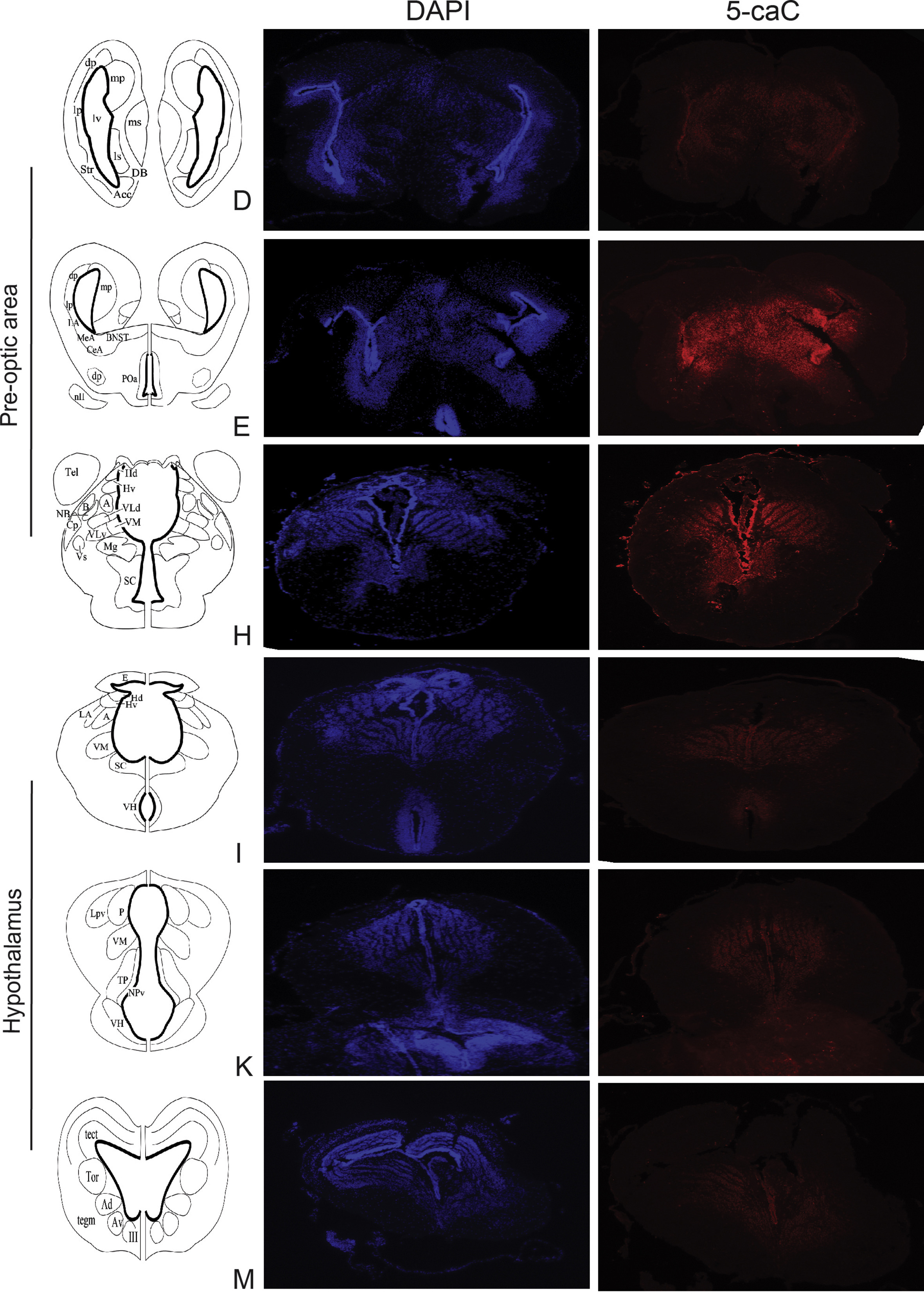 Supplemental Fig. 19. Distribution of 5-caC immunoreactivity in X. tropicalis brain at metamorphic climax. We conducted immunohistochemistry for 5-caC on 16 µm transverse sections of NF stage 62 X. tropicalis brain. Shown are representative images taken at 4X magnification; we analyzed three brains with similar results. Letters next to schematic diagrams represent the corresponding brain regions shown in Supplemental Fig 17. |