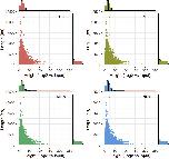 Supplemental Fig. 3. Comparisons of length and height of MethylCap-seq peaks at four stages of metamorphosis. Shown are scatter plots with peak height (x-axis) and length (y-axis). Histograms showing the distribution of peak height and length are also shown. The peak height values are log2 fold-height values vs input samples. The length and height of peaks are not different between stages of metamorphosis. |