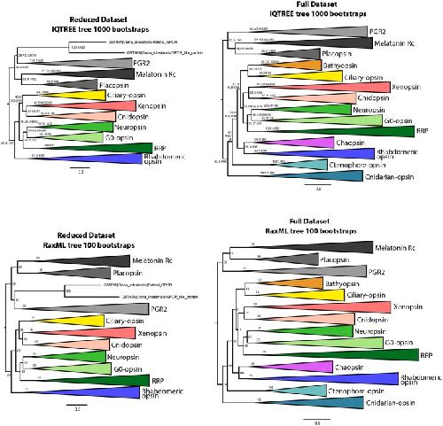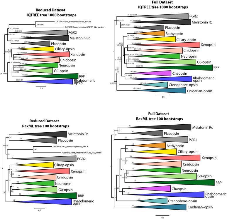 Figure 1—figure supplement 2. IQtree and RaxML trees showing the influence of the small opsin clades (i.e. chaopsins, bathyopsins, ctenophore and anthozoan opsins) on the position of xenopsins in relation to c-opsins and tetra-opsins (Neuropsin, Go-opsin and RRP); inclusion of these small opsin clades brings xenopsins close to tetraopsins (full dataset), their exclusion brings xenopsins close to c-opsins (reduced dataset). |
