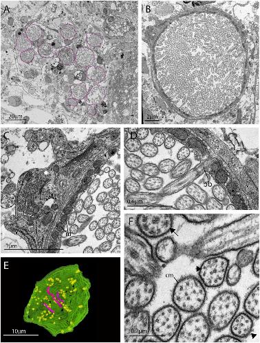 Figure 4. The morphology of the ciliary phaosomal cells in adult Maritigrella crozieri.(A) A dense cluster of intra-cellular vacuoles (phaosomes â highlighted in magenta) filled with cilia (n = 3 individuals). (B) Multiple cilia in the phaosome. (C) A possible unpigmented supporting cell (asterisk) wrapping around the phaosome cell with mitochondria (m) and Golgi apparatus (ga) in the cytoplasm. (D) Ciliary axonemata (ax) are anchored in the cytoplasmic layer (cl) by basal bodies (bb). (E) 3D reconstruction of the interior of a third of a phaosome, showing that the cilia are unbranched (pink) and the basal bodies (yellow) are distributed all around the phaosome. (F) Cross sections of the ciliary axonemata show various arrangements of microtubules: 9 Ã 2+ two with dynein arms attached to the A-tubules (arrow), 9 + 2 singlets (double arrowheads), and singlets (triple arrowheads). This variation is related to the distance from the basal body (Figure 4âvideos 3), (cm) ciliary membrane.Figure 4âvideo 1. Serial SEM images (101 à 500 nm sections = 50.5 μm total thickness) showing a cluster of ciliary phaosomes (intra-cellular vacuoles housing multiple cilia) that form the outer segment of the putative extraocular CPR cells in adult Maritigrella.This cluster is located to the left of the brain. |