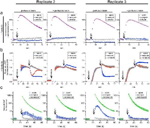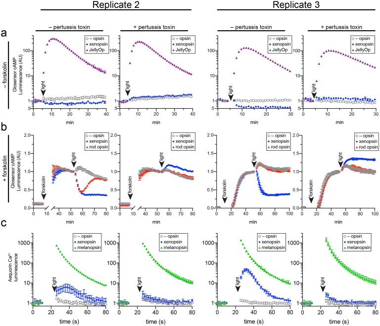 Figure 6—figure supplement 2. Two further biological replicates of the secondary messenger assays show there was quantitative variation from day to day in the magnitude of responses to light and forskolin, but the qualitative response of each opsin was consistent (excluding one replicate in which rod opsin showed no activity, possibly due to a faulty preparation of plasmid DNA). |