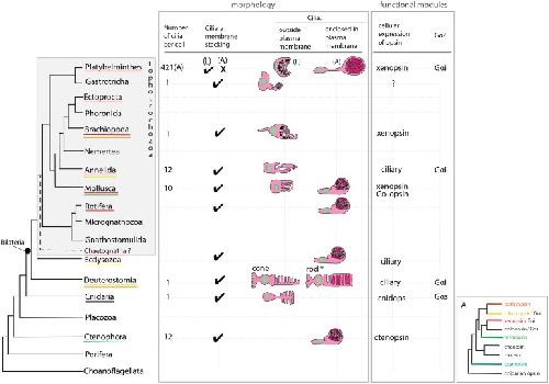 Figure 7. An overview of metazoan ciliary photoreceptor morphology, opsin expression and Gα-protein coupling (determined from cellular assays), highlighting the distinct morphology of the ciliary phaosomes in flatworms and possible convergent evolution of enclosed ciliary membranes in invertebrate phaosomes and jawed vertebrate rods (*).The colored lines under the phylum names represent the presence of the opsin sub-type in the taxonomic group; note the higher prevalence of xenopsins over ciliary opsins in Lophotrochozoa. (L) = larval photoreceptor, (A) = adult photoreceptor. Box A shows the opsin relationships according to our phylogeny and the known Gα-binding of opsins expressed in ciliary photoreceptors. |