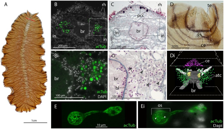 Figure 3. Acetylated tubulin staining identifies two dense clusters of extraocular cells, possible ciliary photoreceptors (CPR), either side of the adult brain.(A) Live adult, red line shows plane of cross section in B-C. (B and C) Consecutive sections showing; (B) two clusters of acetylated tubulin+ cells and; (C) their distribution between the brain (br) (which is encapsulated in a basal lamina, bl) and intestinal branches (in) (n = 5 individuals). Bi and Ci) Close up showing that these cells (arrowheads) are embedded in extracellular matrix in close proximity to the main nerve tracts (arrow). Pigment cup cells (pcc), rhabdites (rh). (D) Anterior end of adult showing pigmented eyes above the brain (cerebral eyes, ce) and on the tentacles (tentacular eyes, te). (Di) Schematised distribution of acetylated tubulin+ cells (act) and cerebral eyes on a micro-CT reconstruction of the brain and main anterior (white), posterior (gray), and two of the optic (yellow) nerve tracts. (E) Confocal projection of a putative CPR and, Ei) an optical slice of the same cell showing cilia projecting into the intra-cellular vacuole or phaosome (arrowheads) in the outer segment (os). |