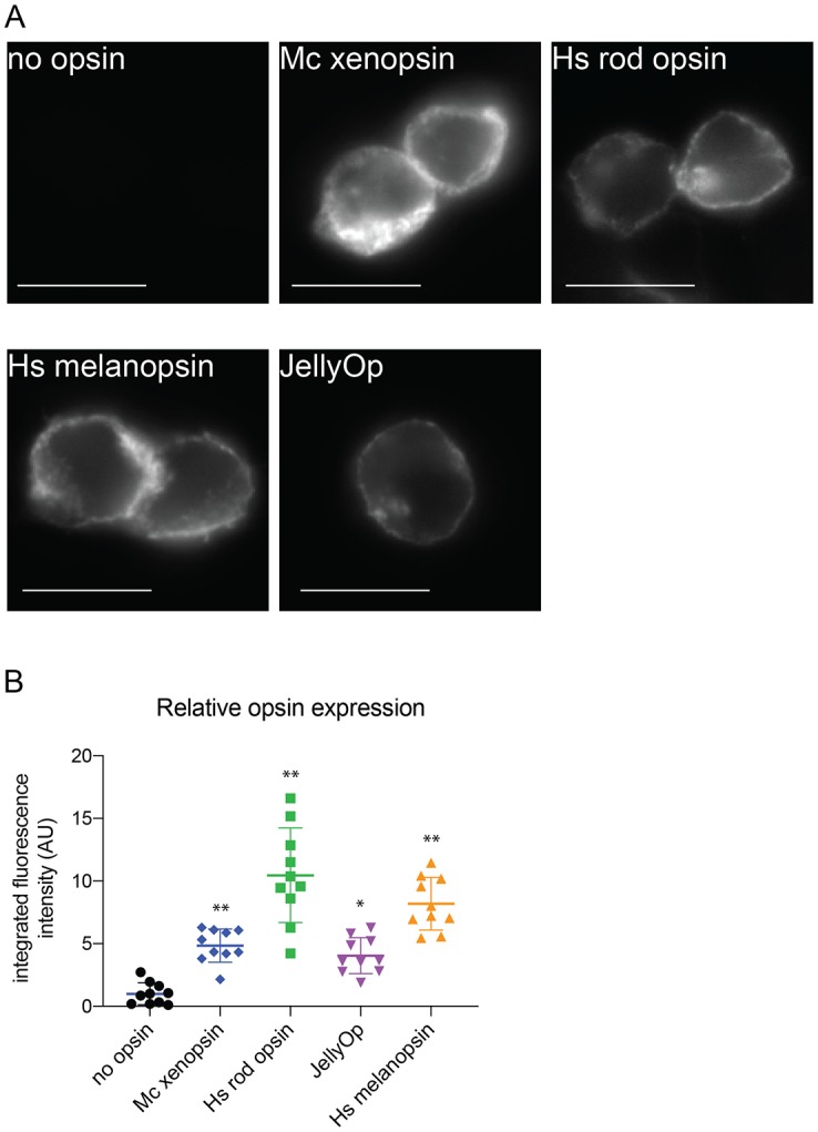 Figure 6—figure supplement 1. Immunofluorescence to quantify opsin expression in HEK293 cells.Cells were transfected with opsins, fixed, stained with 1D4 anti-rod opsin antibody and fluorescent secondary antibody, and imaged on a fluorescent microscope. (A) Representative images of cells expressing each opsin and control (scale = 10 µm). (B) Quantification of integrated fluorescence intensity (minus background) for ten randomly selected fields from each sample, normalized to mean of no-opsin control, with mean and SEM. ANOVA and Dunnett’s multiple comparison test show significant differences between no opsin control and positive opsin conditions (*<0.05*, *<0.01). Mc xenopsin (Maritigrella crozieri xenopsin), Hs rod opsin (human rhodopsin), Hs melanopsin (Human melanopsin), JellyOp (Carybdea rastonii jellyfish opsin), SEM (standard error of the mean). |
