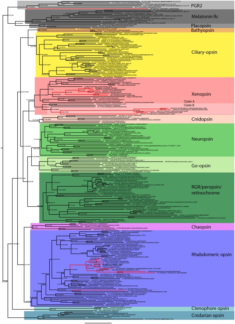 Figure 1. Phylogenetic analysis of metazoan opsins supports flatworm ciliary-like opsins as xenopsins and confirms a clade of flatworm rhabdomeric opsins.Support for nodes is calculated using 1000 Ultrafast bootstrap replications as well as 1000 SH-aLRT replicates and approximate aBayes single Branch testing. Black dots indicate nodes with support values for three tests â¥Â 95% (0.95 for SH-aLRT replicates). Gray dots indicate nodes with support values for three tests â¥Â 90% (0.90 for SH-aLRT replicates). Scale bar unit for branch length is the number of substitutions per site. Branches in red correspond to flatworm opsin sequences. See Figure 1âfigure supplement 1 for uncollapsed tree and Figure 1âsource data 1 for gene accession numbers. The new xenopsin sequences we found in polyclad and triclad flatworms, plus a bryozoan and chaetognath, all fall within clade A of the xenopsins.10.7554/eLife.45465.007Figure 1âsource data 1. Sequence data for opsins used in phylogenetic analyses for Figure 1.Figure 1âfigure supplement 1. Uncollapsed tree of IQ-TREE phylogenetic reconstruction of opsin relationships.Node support values correspond to 1000 Ultrafast bootstrap replications, 1000 SH-aLRT replicates and approximate aBayes single Branch testing. Scale bar unit for branch length is the number of substitutions per site. Note low support for all deeper nodes including those uniting xenopsin/cnidopsin with tetraopsins, and the sister relationship between this clade and the c-opsins/bathyopsins. Branches in red correspond to flatworm opsin sequences. |