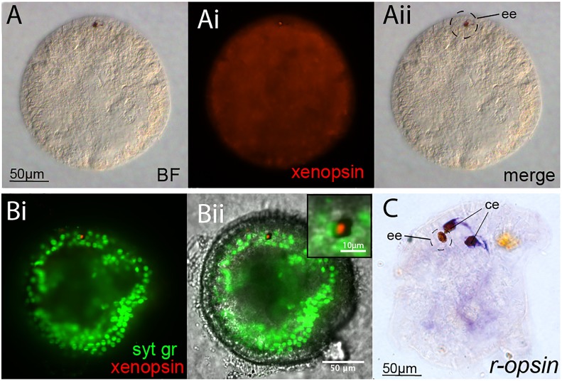 Figure 2—figure supplement 1. Opsin localization and expression in Maritigrella embryos and larva.(A and B) Xenopsin expression (red) in the epidermal eye (ee) during Maritigrella crozieri embryogenesis. The epidermal eye develops soon after gastrulation is complete and before development of the cerebral eyes. Syt gr = Sytox Green, staining nuclei. Bright-field (BF) also shows the photoreceptor pigments. Inset is a 3-time magnification. (C) R-opsin expression is expressed in the two cerebral eyes (ce) of the larva but not the epidermal eye. |