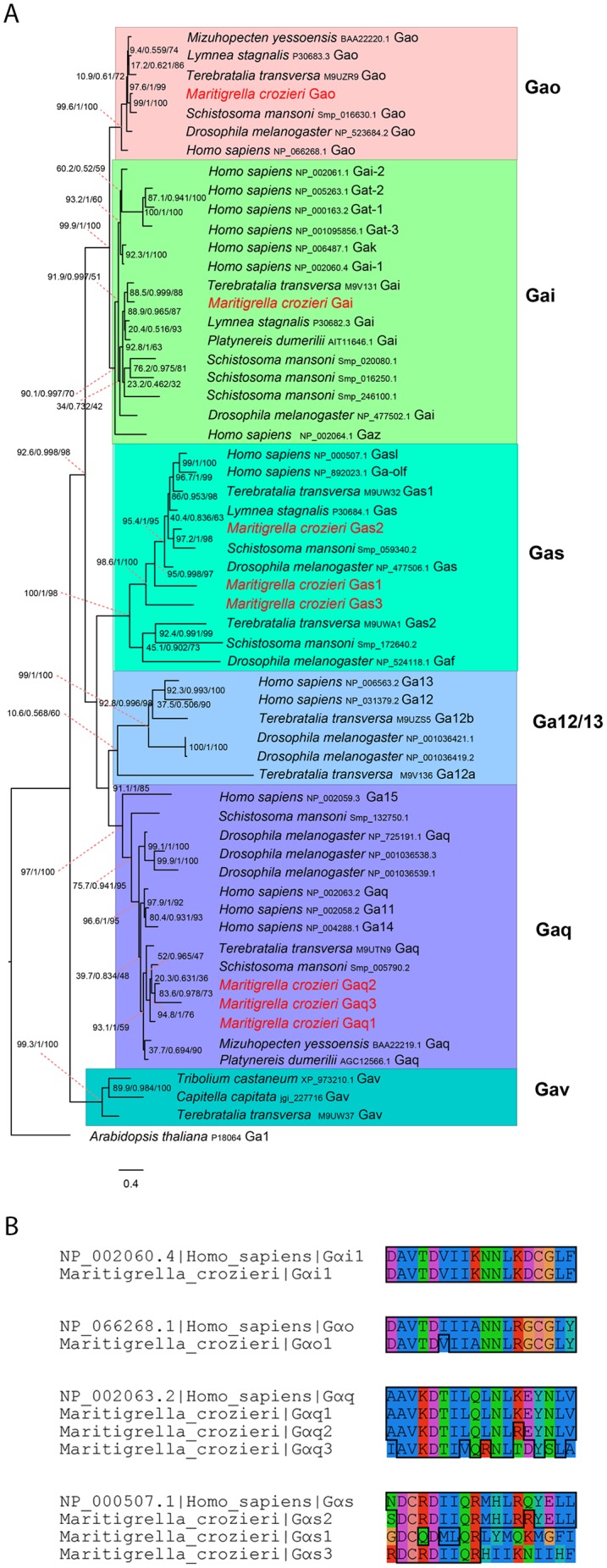 Figure 5—figure supplement 1. G alpha subunit phylogeny and C terminal end alignment.(A) IQ-TREE phylogenetic reconstruction of G alpha subunit relationships identifies those expressed in the Maritigrella crozieri larval transcriptome (red). Support for node is calculated using 1000 Ultrafast bootstrap replications as well as 1000 SH-aLRT replicates and approximate aBayes single branch testing. Scale bar unit for branch length is the number of substitutions per site. (B) Alignment of c terminal ends of Human and Maritigrella crozieri G alpha subunits. See Figure 1 additional data file for full amino acid sequences from all taxa. |