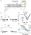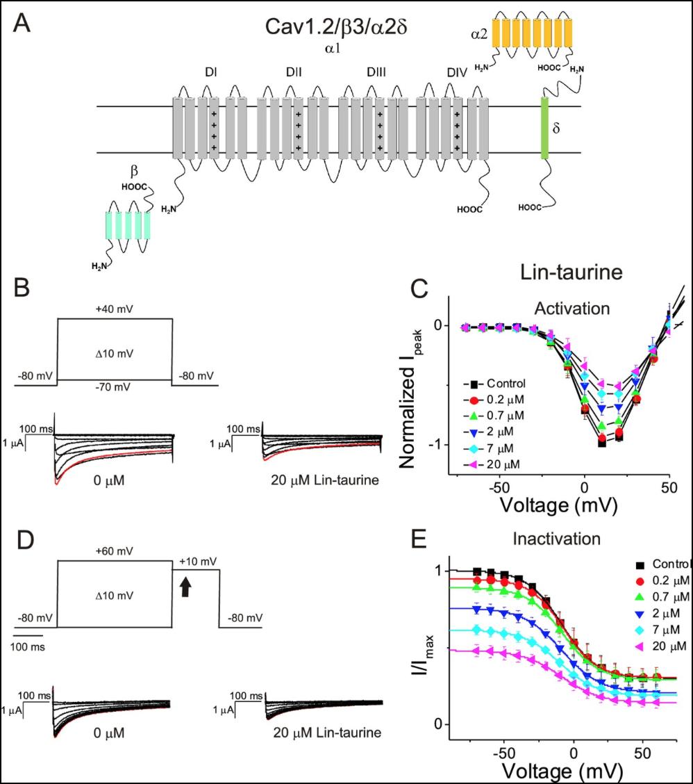Figure 2- PUFA analogue, Linoleoyl-taurine, inhibits Cav1.2/β3/α2δ channels without altering channel voltage dependence. (A) Simplified membrane topology of the Cav1.2 pore-forming α-subunit (light gray) and auxiliary β- (mint) and α2δ-subunits (yellow and green). (B) Voltage protocol used to measure voltage dependence of activation and representative Cav1.2/β3/α2δ current traces in control (0 μM) and 20 μM Lin-taurine. (C) Current-voltage relationship demonstrating dose-dependent inhibition of Cav1.2/β3/α2δ currents measured from activation protocol (mean ± SEM; n = 5). (D) Voltage protocol used to measure voltage dependence of inactivation and representative Cav1.2/β3/α2δ current traces in control (0 μM) and 20 μM Lin-taurine measured at arrow. (E) Current-voltage relationship demonstrating dose-dependent inhibition of Cav1.2/β3/α2δ currents measured from inactivation protocol (mean ± SEM; n = 5). See Figure 2âfigure supplement 1 for comparison with effects on Cav1.2/β2/α2δ. |