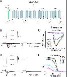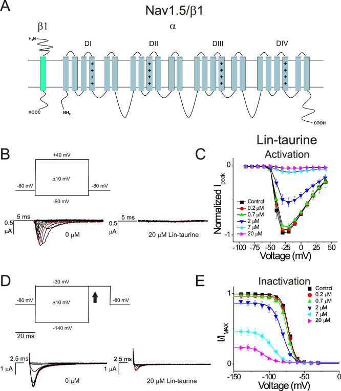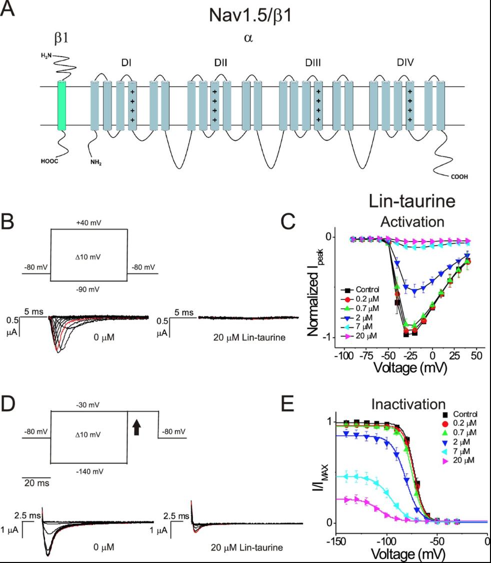Figure 3- PUFA analogue, Linoleoyl-taurine, inhibits Nav1.5/β1 by shifting the voltage dependence of inactivation. (A) Simplified membrane topology of the Nav1.5 pore-forming α-subunit (light blue) and auxiliary β-subunit (green). (B) Voltage protocol used to measure voltage dependence of activation and representative Nav1.5/β1 current traces in control (0 μM) and 20 μM Lin-taurine. (C) Current-voltage relationship demonstrating dose-dependent inhibition of Nav1.5/β1 currents measured from activation protocol (mean ± SEM; n = 5). (D) Voltage protocol used to measure voltage dependence of inactivation and representative Nav1.5/β1 current traces in control (0 μM) and 20 μM Lin-taurine measured at arrow. (E) Current-voltage relationship demonstrating dose-dependent inhibition of Nav1.5/β1 currents and leftward shift in the voltage dependence of inactivation measured from inactivation protocol (mean ± SEM; n = 5). |