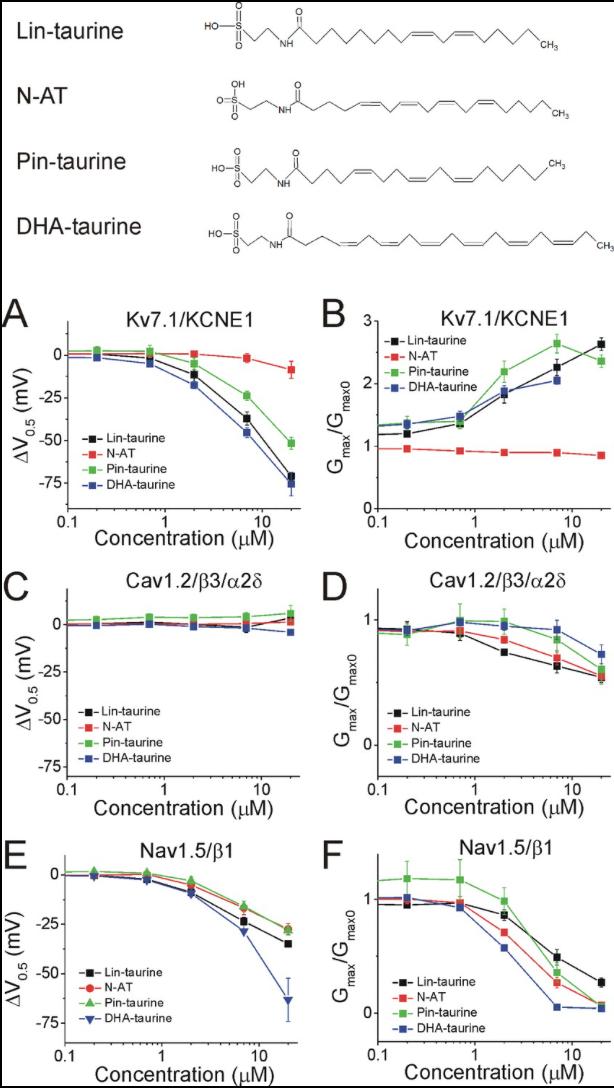 Figure 4- PUFA analogues with taurine head groups have the tendency to broadly modulate Kv7.1/KCNE1, Cav1.2/β3/α2δ, and Nav1.5/β1 channels. Structures for PUFA analogues with taurine head groups: Lin-taurine, N-AT, Pin-taurine, and DHA-taurine (top). (AâB) Dose dependent shifts in the (A) voltage dependence of activation (ÎV0.5) and (B) changes in maximal conductance (Gmax) for Kv7.1/KCNE1 induced by Lin-taurine (black squares; n = 3; mean ± SEM), N-AT (red circles; n = 5; mean ± SEM), Pin-taurine (green triangles; n = 4; mean ± SEM), and DHA-taurine (blue triangles; n = 3; mean ± SEM). (CâD) Dose dependent shifts in the (C) voltage dependence of inactivation (ÎV0.5) and (D) changes in maximal conductance (Gmax) for Cav1.2/β3/α2δ induced by Lin-taurine (black squares; n = 3; mean ± SEM), N-AT (red circles; n = 3; mean ± SEM), Pin-taurine (green triangles; n = 5; mean ± SEM), and DHA-taurine (blue triangles; n = 3; mean ± SEM). (EâF) Dose dependent shifts in the (E) voltage dependence of inactivation (ÎV0.5) and (F) changes in maximal conductance (Gmax) for Nav1.5/β1 induced by Lin-taurine (black squares; n = 3; mean ± SEM), N-AT (red circles; n = 3; mean ± SEM), Pin-taurine (green triangles; n = 4; mean ± SEM), and DHA-taurine (blue triangles; n = 3; mean ± SEM). See Figure 4âfigure supplements 1â6 for more details. |