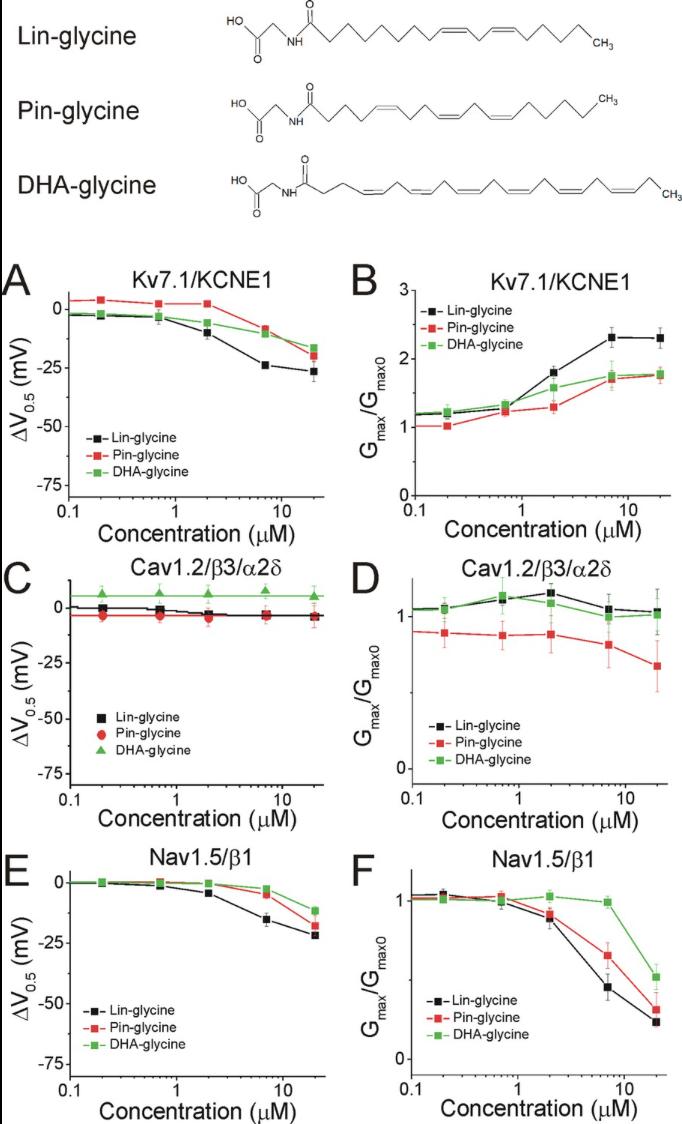 Figure 5- PUFA analogues with glycine head groups tend to be more selective for Kv7.1/KCNE1 than Cav1.2/β3/α2δ and Nav1.5/β1 channels. Structures for PUFA analogues with glycine head group: Lin-glycine, Pin-glycine, and DHA-glycine (top). (AâB) Dose dependent shifts in the (A) voltage dependence of activation (ÎV0.5) and (B) changes in maximal conductance (Gmax) for Kv7.1/KCNE1 induced by Lin-glycine (black squares; n = 4; mean ± SEM), Pin-glycine (red circles; n = 3; mean ± SEM), and DHA-glycine (green triangles; n = 4; mean ± SEM). (CâD) Dose dependent shifts in the (C) voltage dependence of inactivation (ÎV0.5) and (D) changes in maximal conductance (Gmax) for Cav1.2/β3/α2δ induced by Lin-glycine (black squares; n = 4; mean ± SEM), Pin-glycine (red circles; n = 3; mean ± SEM), and DHA-glycine (green triangles; n = 3; mean ± SEM). (EâF) Dose dependent shifts in the (E) voltage dependence of inactivation (ÎV0.5) and (F) changes in maximal conductance (Gmax) for Nav1.5/β1 induced by Lin-glycine (black squares; n = 4; mean ± SEM), Pin-glycine (red circles; n = 4; mean ± SEM), and DHA-glycine (green triangles; n = 7; mean ± SEM). See Figure 4âfigure supplements 1â6 for more details. |
