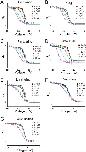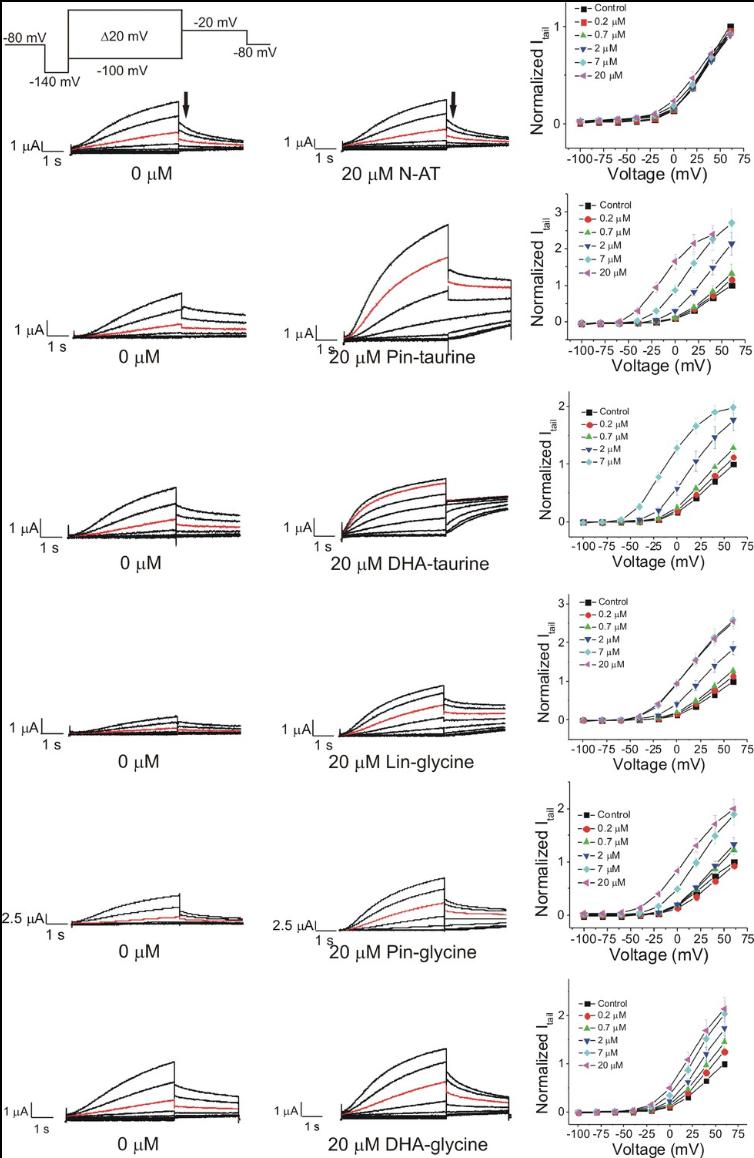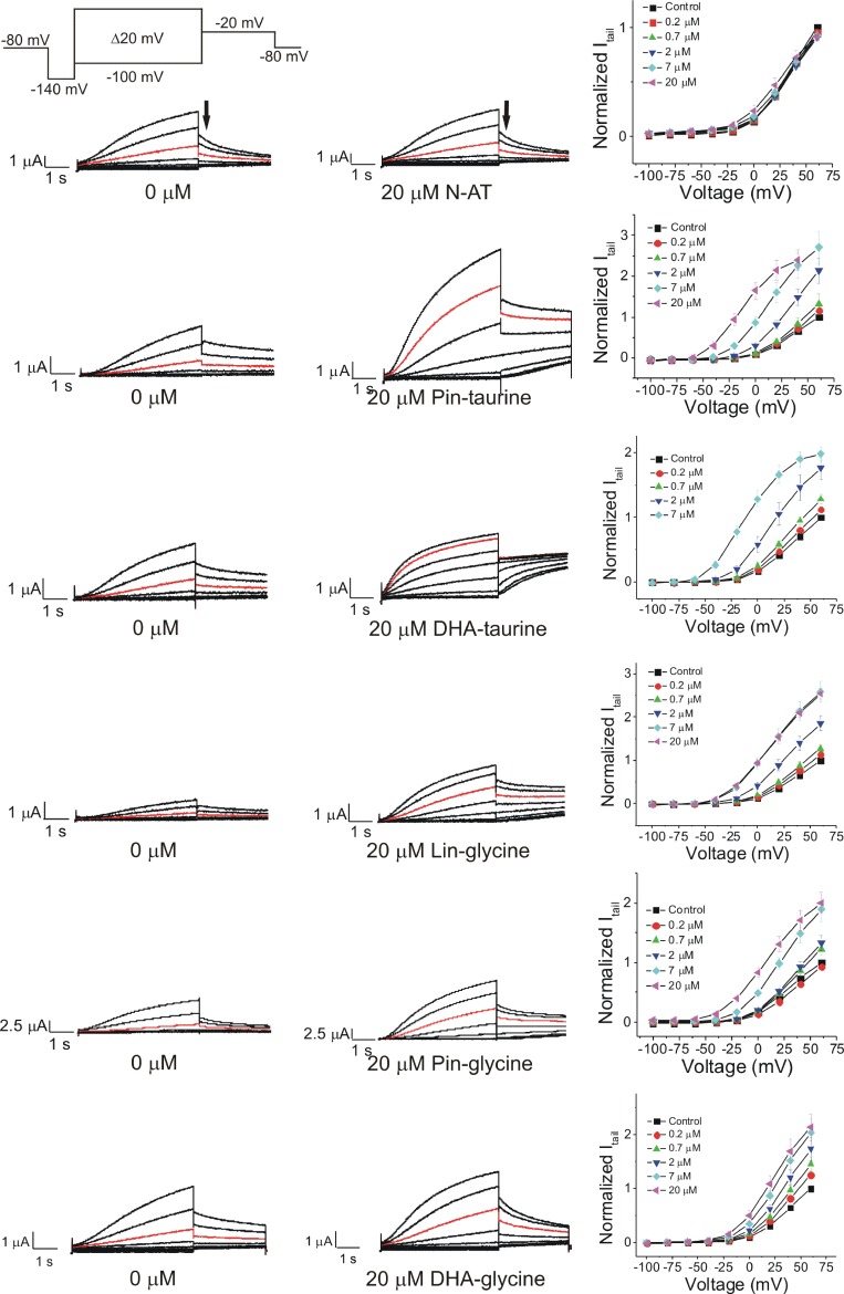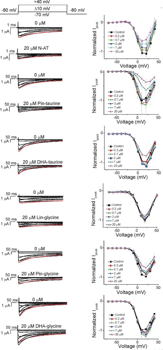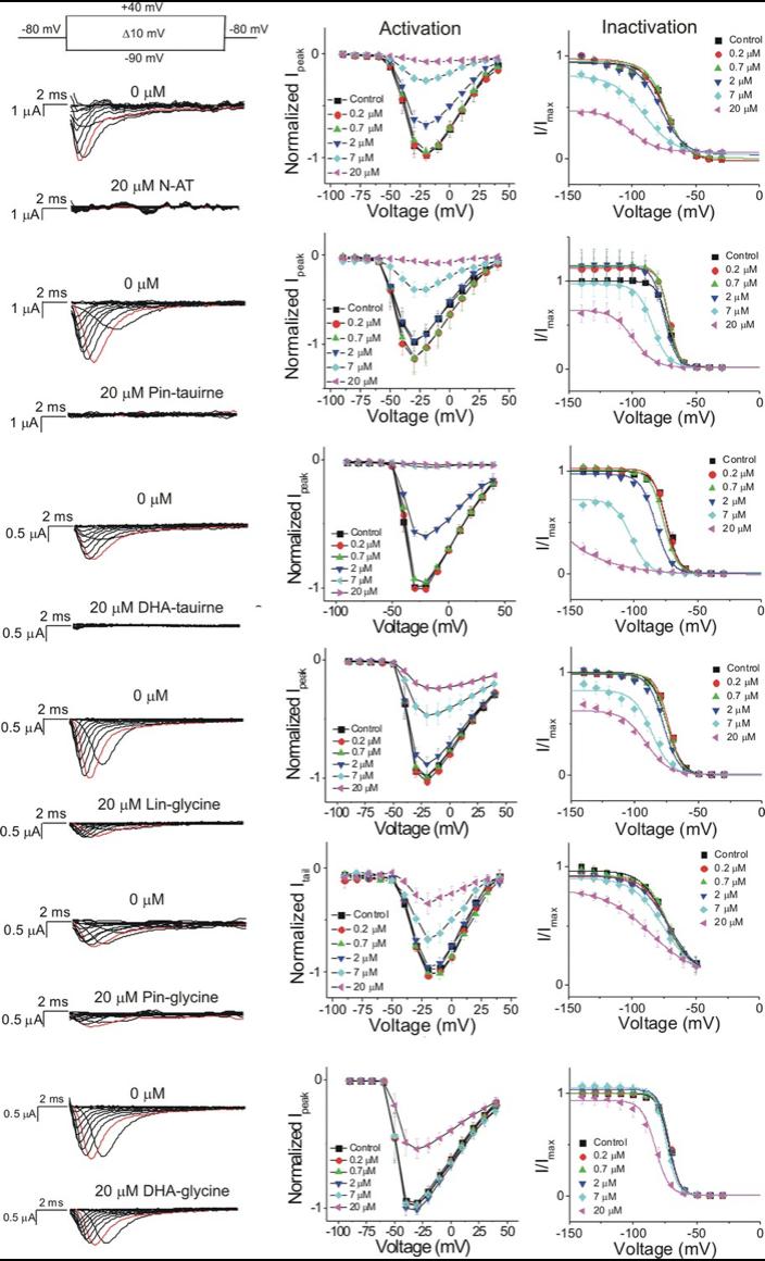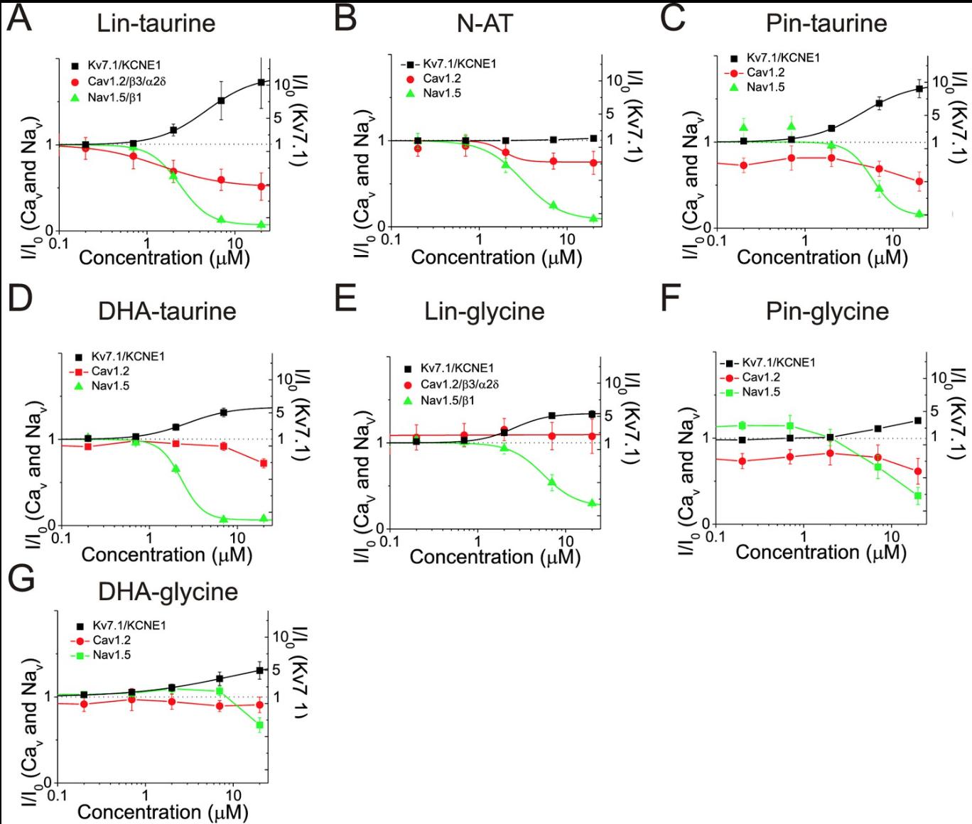 Figure 6- Dose response curves for PUFAs on IKs, ICaL, and INaV at 0 mV. Dose response of IKs, ICaL, and INaV currents (I/I0) at 0 mV for (A) Lin-taurine (Km of IKs = 11.4 ± 0.4 μM; Km of ICaL = 1.4 ± 0.4 μM; Km of INaV = 2.4 ± 0.04 μM; mean ± SEM), (B) N-AT (Km of IKs = NA; Km of ICaL = 2.5 ± 1.9 μM; Km of INaV = 3.1 ± 0.3 μM; mean ± SEM), (C) Pin-taurine (Km of IKs = 4.5 ± 0.2 μM; Km of ICaL = NA; Km of INaV = 5.8 ± 1.7 μM; mean ± SEM), (D) DHA-taurine (Km of IKs = 5.9 ± 0.3 μM; Km of ICaL >20 μM; Km of INaV = 2.3 ± 0.1 μM; mean ± SEM), (E) Lin-glycine (Km of IKs = 5.4 ± 0.2 μM; Km of ICaL = NA; Km of INaV = 5.6 ± 0.5 μM; mean ± SEM), (F) Pin-glycine (Km of IKs > 20 μM; Km of ICaL = NA; Km of INaV >20 μM; mean ± SEM), and (G) DHA-glycine (Km of IKs > 20 μM; Km of ICaL = NA; Km of INaV >20 μM; mean ± SEM),. |