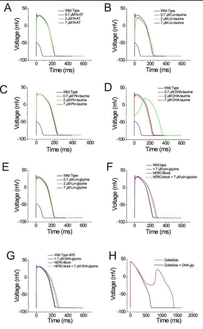 Figure 7- PUFAs that are selective for Kv7.1/KCNE1 channels partially restore prolonged ventricular action potential and suppress early afterdepolarizations in cardiomyocyte simulations. (AâG) Simulated ventricular action potential in wild type cardiomyocytes (black) and in the presence of (A) 0.7 (red), 2 (green), and 7 μM N-AT (blue), (B) 0.7 (red), 2 (green), and 7 μM lin-taurine (blue), (C) 0.7 (red), 2 (green), and 7 μM pin-taurine (blue), (D) 0.7 (red), 2 (green), and 7 μM DHA-taurine (blue), (E) 0.7 (red), 2 (green), and 7 μM lin-glycine (blue), (F) 7 μM pin-glycine (blue solid), following 25% hERG block (red) and in the presence of 7 μM pin-glycine under 25% hERG block (blue dashed), and (G) 7 μM DHA-glycine (blue solid), following 25% hERG block (red) and in the presence of 7 μM DHA-glycine under 25% hERG block (blue dashed). (H) Early afterdepolarizations induced by dofetilide application (red) and suppression of early afterdepolarizations by 7 μM DHA-glycine in the presence of dofetilide (black). See Figure 7âfigure supplement 1 for rate dependence of the effects. |