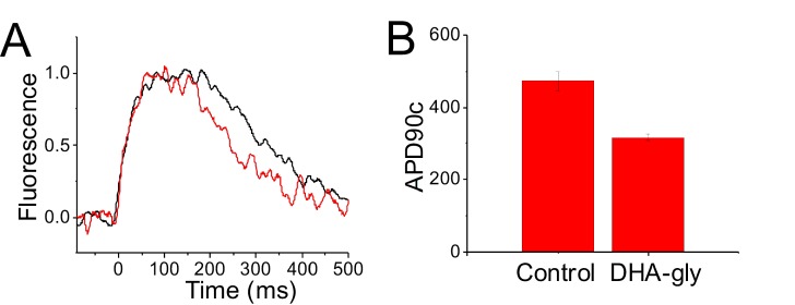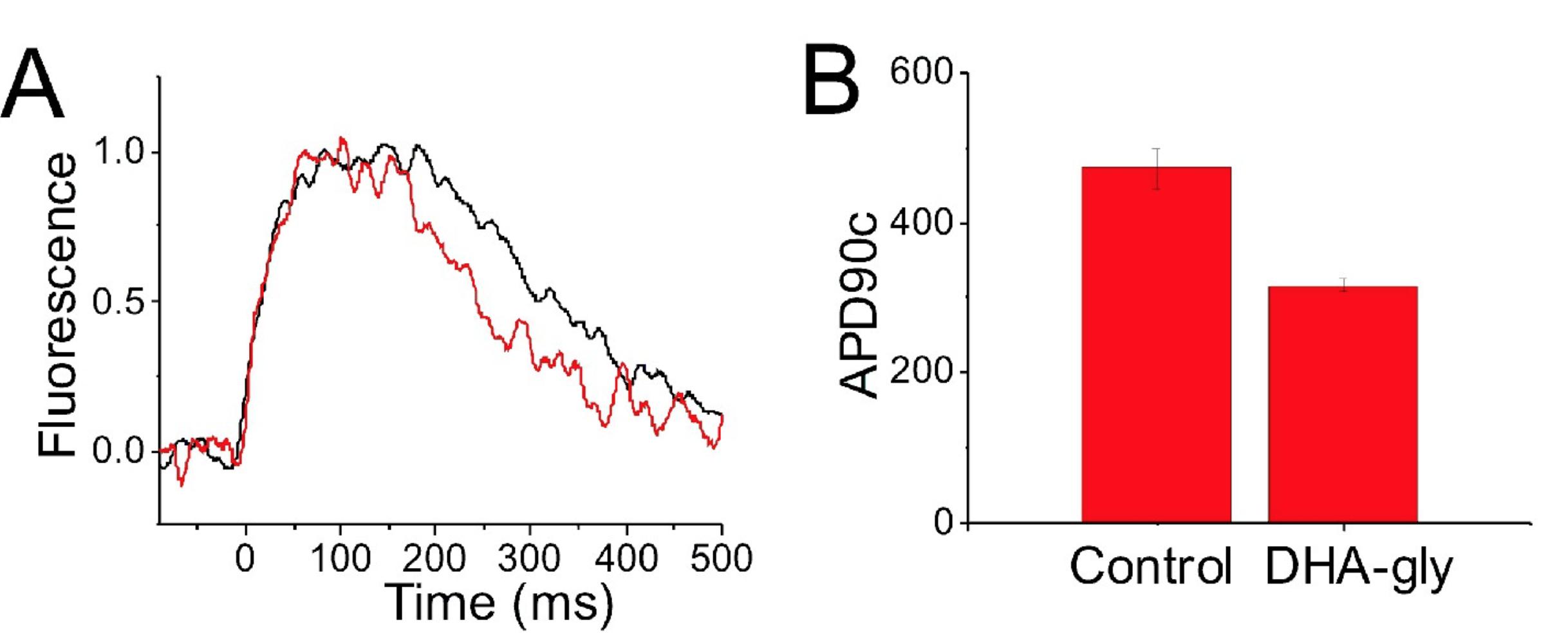 Figure 8. DHA-glycine decreases the APD90c of hiPSC cardiomyocytes.(A) Normalized representative CaT optical traces before (black) and after applied (red) 30 µM DHA-glycine on a monolayer of hiPSC-CM. (B) APD90c (ms) value in control conditions (black) and after applied (red) 30 µM DHA-glycine on hiPSC-CM (mean ± SEM; n = 3). *p<0.05. |