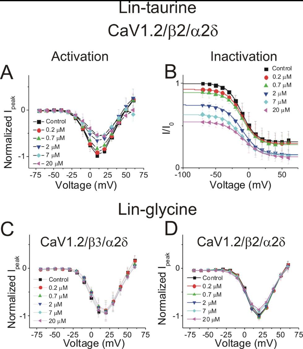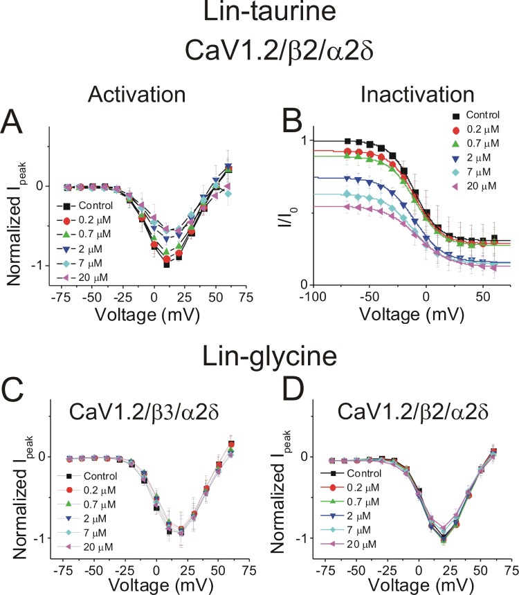 Supplementary figure 1- PUFA-induced effects on Cav1.2 expressed with β-subunit β2 and α2δ (Cav1.2/β2/α2δ). (A) Voltage dependence of activation for Cav1.2/β2/α2δ in the presence of Lin-taurine. (B) Voltage dependence of inactivation for Cav1.2/β2/α2δ in the presence of Lin-taurine. (CâD) Comparison between the voltage dependence of activation for (C) Cav1.2/β3/α2δ and (D) Cav1.2/β2/α2δ in the presence of Lin-glycine. |