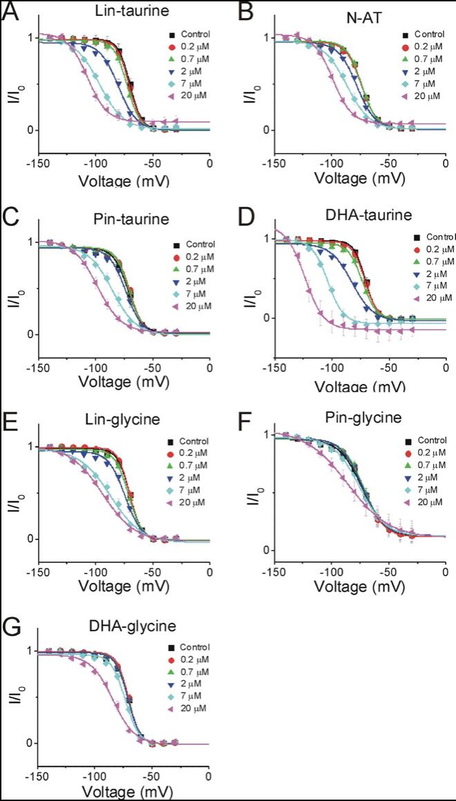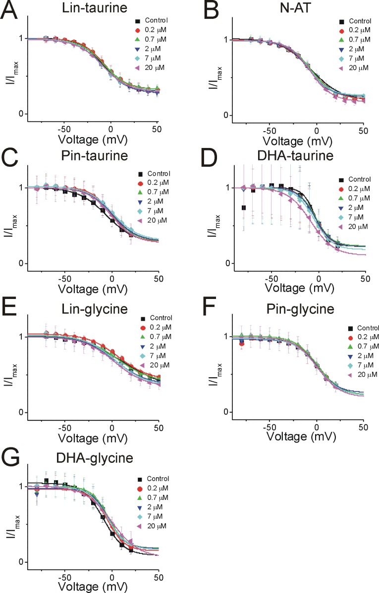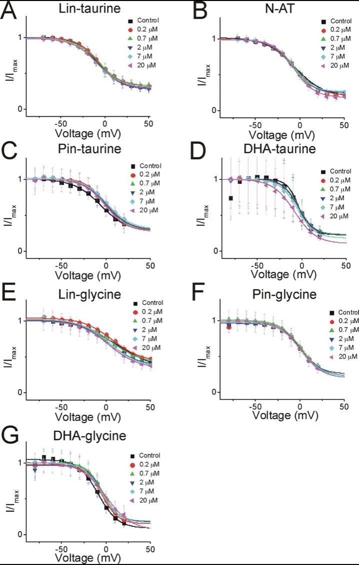 Supplementary figure 5- Internally normalized steady state inactivation curves for Cav1.2/β3/α2δ. (AâG) PUFA-induced effects on Nav1.5/β1 voltage dependent inactivation normalized by each concentration for: (A) Lin-taurine, (B) N-AT, (C) Pin-taurine, (D) DHA-taurine, (E) Lin-glycine, (F) Pin-glycine, and (G) DHA-glycine. |