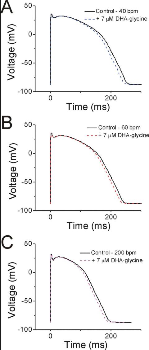 Figure 7—figure supplement 1. Rate dependence of the simulated ventricular action potential and effects of DHA-glycine.(A) Simulations of the ventricular action potential at 40 bpm in control conditions (black) and simulated effects of 7 µM DHA-glycine (blue dashed line). (B) Simulations of the ventricular action potential at 60 bpm in control conditions (black) and simulated effects of 7 µM DHA-glycine (red dashed line). (C) Simulations of the ventricular action potential at 200 bpm in control conditions (black) and simulated effects of 7 µM DHA-glycine (magenta dashed line). |