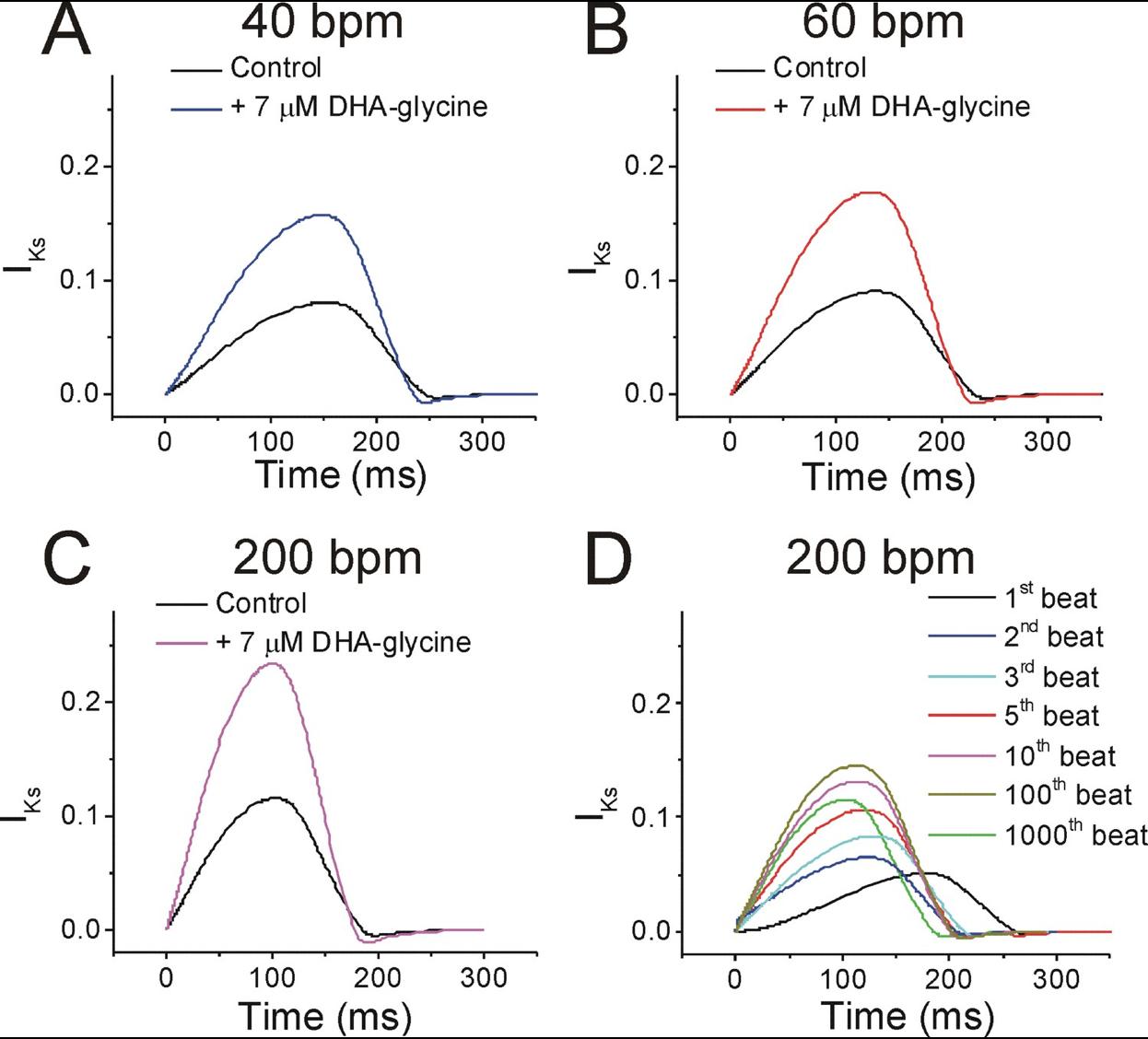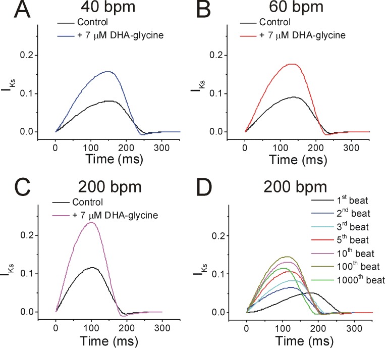 Supplementary figure 9- Rate dependence of the IKs current during simulated ventricular action potentials and effects of DHA-glycine. (A) Simulations of the IKs current during the ventricular action potential at 40 bpm in control conditions (black line) and in 7 µM DHA-glycine (dark blue line). (B) Simulations of the IKs current during the ventricular action potential at 60 bpm in control conditions (black) and in 7 µM DHA-glycine (red dashed line). (C) Simulations of the IKs current during the ventricular action potential at 200 bpm in control conditions (black) and in 7 µM DHA-glycine (magenta dashed line). (D) IKs currents during simulation of the ventricular action potential at 200 bpm in control conditions after the indicated number of beats. |