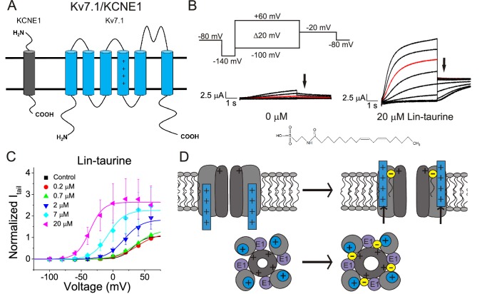 Figure 1- PUFA analogue, Linoleoyl-taurine, activates Kv7.1/KCNE1 channels through an electrostatic mechanism on voltage sensor and pore. (A) Simplified membrane topology of a single Kv7.1 α-subunit (blue) and a single KCNE1 β-subunit (grey). (B) Voltage protocol used to measure voltage dependence of activation and representative Kv7.1/KCNE1 current traces in control (0 μM) and 20 μM Lin-taurine. Arrows mark tail currents. (C) Current-voltage relationship demonstrating PUFA analogue-induced left-shift in the voltage-dependence of activation (V0.5) and increase in maximal conductance (Gmax) (mean ± SEM; n = 3). (D) Model in which PUFA analogues with their negatively charged head groups insert in the cell membrane close to the positively charged arginines in the voltage sensor S4 and close to a positively charged lysine in the pore. The PUFA thereby exerts an electrostatic effect on the voltage sensor to shift the voltage dependence of activation and an electrostatic effect on the pore to increase the maximum conductance (Liin et al., 2018a). |