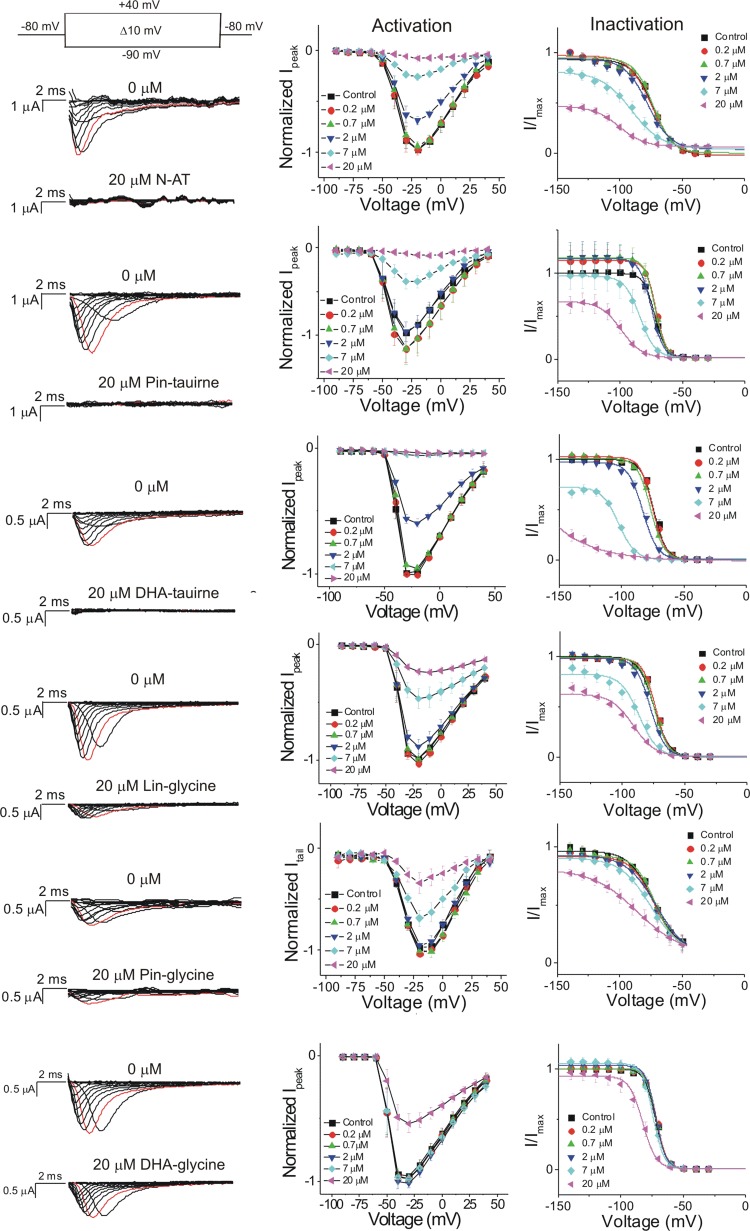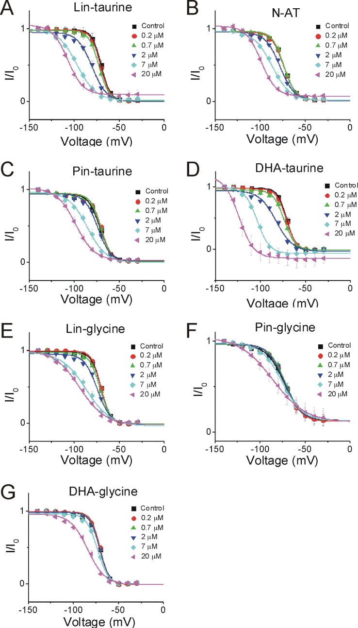 Supplementary figure 7- Internally normalized steady state inactivation curves for Nav1.5/β1. (AâG) PUFA-induced effects on Nav1.5/β1 voltage dependent inactivation normalized by each concentration for: (A) Lin-taurine, (B) N-AT, (C) Pin-taurine, (D) DHA-taurine, (E) Lin-glycine, (F) Pin-glycine, and (G) DHA-glycine. |