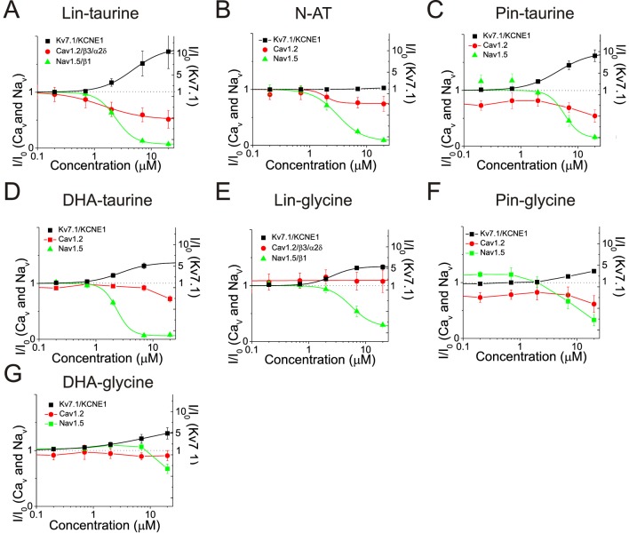 Figure 6. Dose response curves for PUFAs on IKs, ICaL, and INaV at 0 mV.Dose response of IKs, ICaL, and INaV currents (I/I0) at 0 mV for (A) Lin-taurine (Km of IKs = 11.4 ± 0.4 μM; Km of ICaL = 1.4 ± 0.4 μM; Km of INaV = 2.4 ± 0.04 μM; mean ± SEM), (B) N-AT (Km of IKs = NA; Km of ICaL = 2.5 ± 1.9 μM; Km of INaV = 3.1 ± 0.3 μM; mean ± SEM), (C) Pin-taurine (Km of IKs = 4.5 ± 0.2 μM; Km of ICaL = NA; Km of INaV = 5.8 ± 1.7 μM; mean ± SEM), (D) DHA-taurine (Km of IKs = 5.9 ± 0.3 μM; Km of ICaL >20 μM; Km of INaV = 2.3 ± 0.1 μM; mean ± SEM), (E) Lin-glycine (Km of IKs = 5.4 ± 0.2 μM; Km of ICaL = NA; Km of INaV = 5.6 ± 0.5 μM; mean ± SEM), (F) Pin-glycine (Km of IKs > 20 μM; Km of ICaL = NA; Km of INaV >20 μM; mean ± SEM), and (G) DHA-glycine (Km of IKs > 20 μM; Km of ICaL = NA; Km of INaV >20 μM; mean ± SEM),. |
