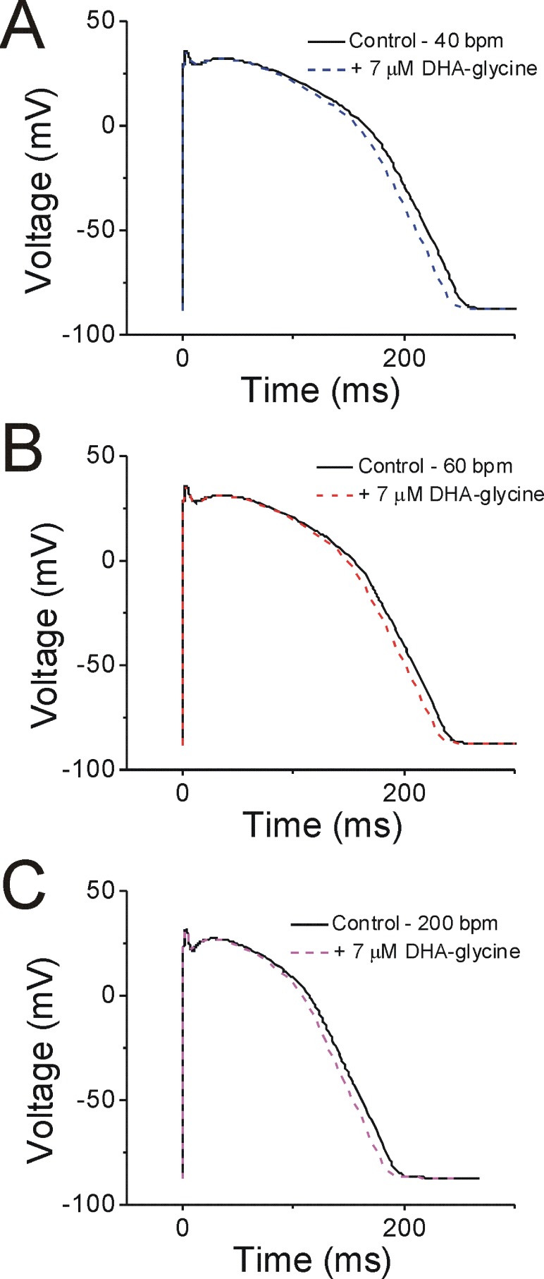 Supplementary figure 8- Rate dependence of the simulated ventricular action potential and effects of DHA-glycine. (A) Simulations of the ventricular action potential at 40 bpm in control conditions (black) and simulated effects of 7 µM DHA-glycine (blue dashed line). (B) Simulations of the ventricular action potential at 60 bpm in control conditions (black) and simulated effects of 7 µM DHA-glycine (red dashed line). (C) Simulations of the ventricular action potential at 200 bpm in control conditions (black) and simulated effects of 7 µM DHA-glycine (magenta dashed line). |