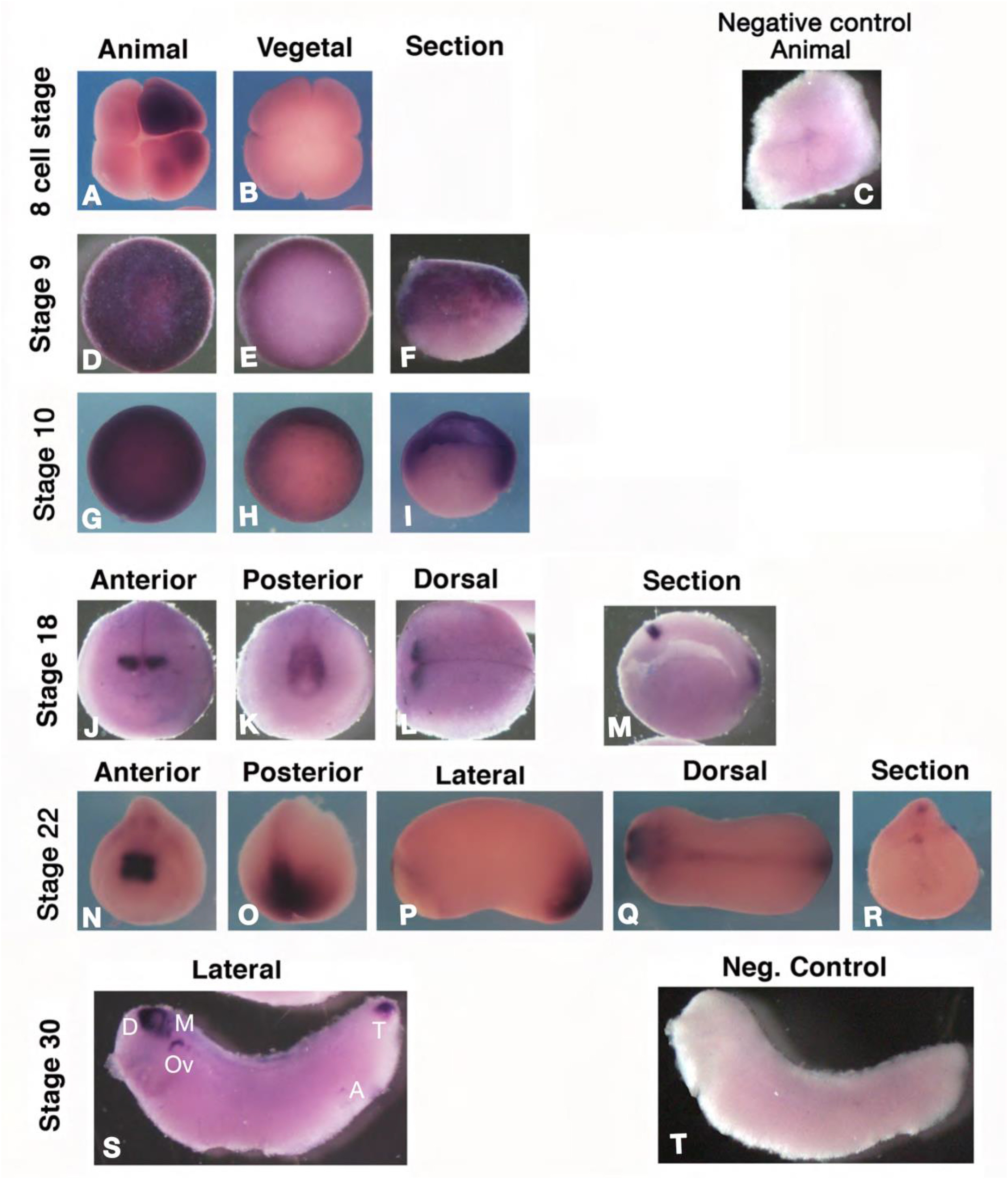 Fig. 1. Expression of Xenopus apcdd1. A-T. RNA in situ hybridization for Xenopus apcdd1. Maternal expression at 8 âcell stage (A, B) is localized in the animal pole and is frequently unevenly distributed. In late blastulas (stage 9, D-F), the expression is animal and marginal (arrows in F, blastocoel in outlined in F). At the start of gastrulation (stage 10, G-I) apcdd1 RNA is present in animal and marginal cells, including the dorsal lip with the Spemann organizer (arrow in H, I, blastocoel is outlined in I). In neurula embryos (stage 18, K-N) and tailbud (stage 22), expression is limited to diencephalon and midbrain precursors (J, K, M, N, Q), and the tailbud (K, M, O, P, Q). Arrowhead in the transversal section (R) indicates ependymal precursors. In tadpoles (stage 30, S) expression closely mirrors that in mouse embryos. D â diencephalon; M â midbrain; Ov â otic vesicle; T â tailbud; A â anus. Bracket in S indicates the branchial arches. For control in situ hybridization (C: 8-cell stage; T: tadpole), the RNA probe used was LacZ. The scale bar in A is 0.3 âmm (all embryos are shown at the same scale). At least 10 Xenopus embryos were examined for each time point. |
