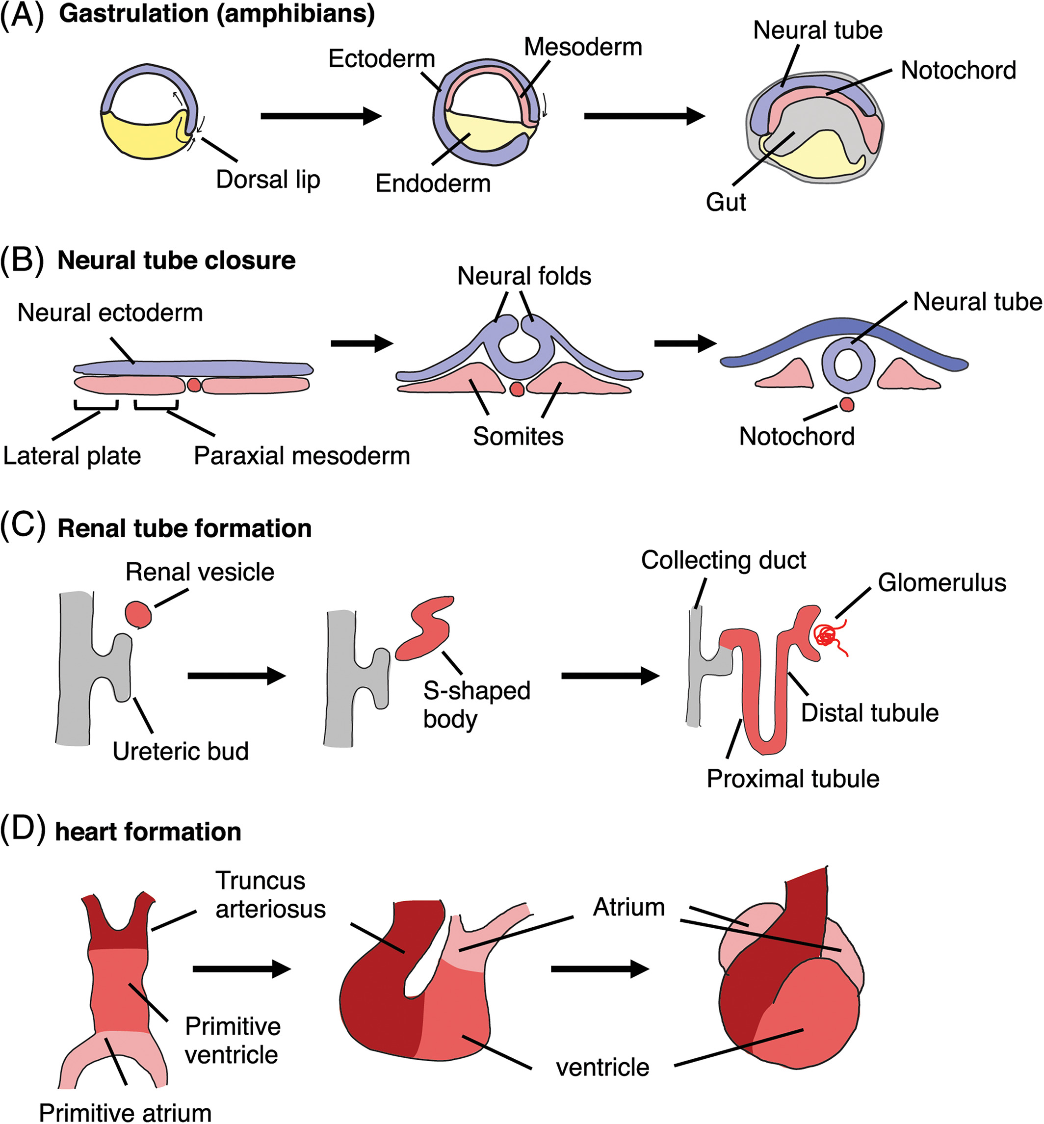 Tubule formation is a fundamental process of various organ development during vertebrate embryogenesis. Illustrations indicate the processes of tubule formation in gastrulation, A, neural tube closure, B, renal tubes, C, and heart tube formation, D. Despite different appearances, organs originated from simple linear tube structures. The primitive tubes ultimately form complicated structures of functional organs by elongation, bending, and thinning processes