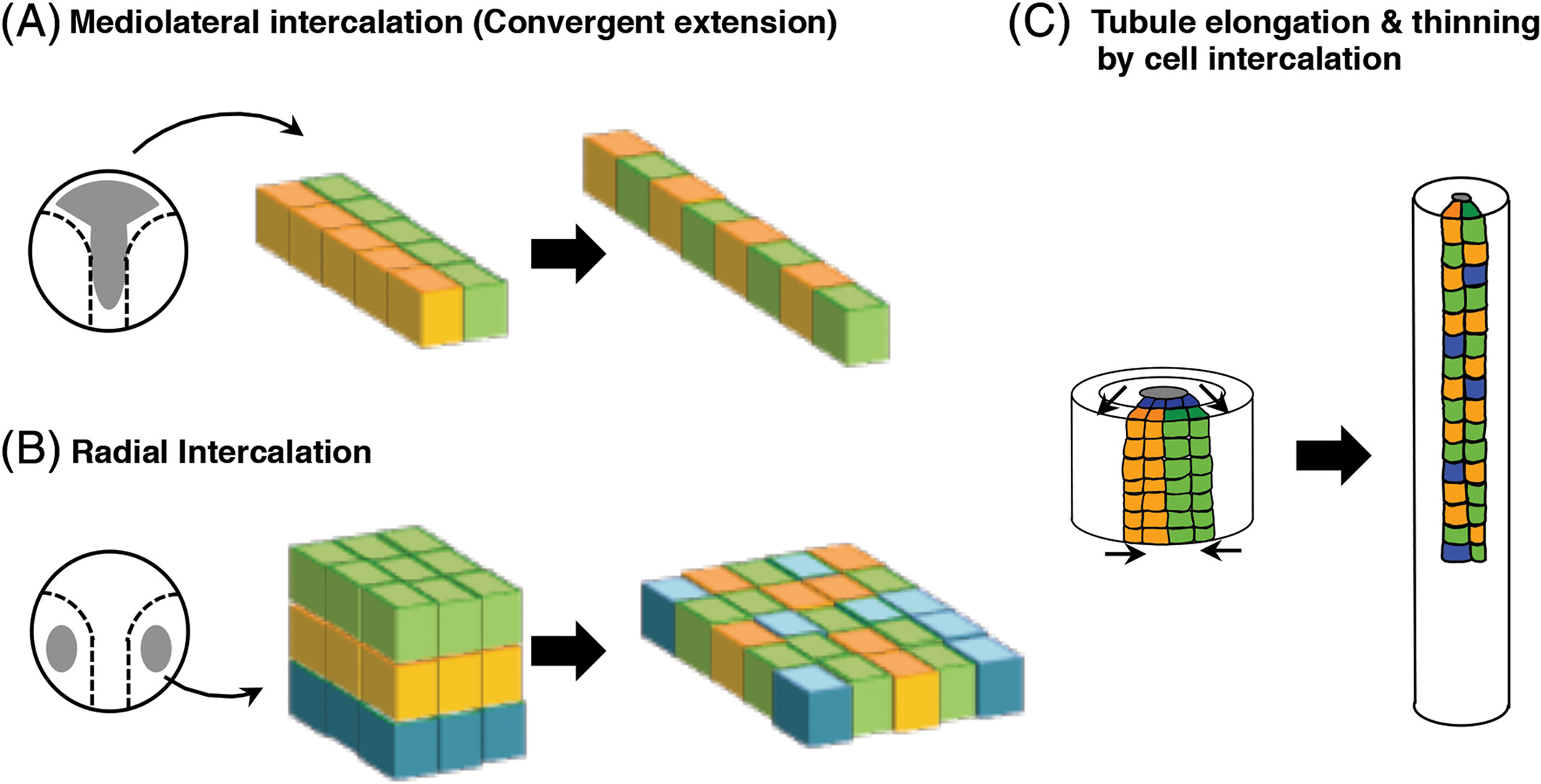 Cell intercalation contributes to tubule elongation and thinning. A, Schematic images of mediolateral intercalation. Mediolateral intercalation occurs in neural tissue of early and late neurula (highlighted by gray in the left image). Cells in same plane intercalate each other. B, Radial intercalation mainly occurs in lateral region of neurulaembryo (highlighted by gray in the left image). Cells in deep layer intercalate into superficial layer. C, During tubule formation, both mediolateral and radial intercalation contributes to tubule elongation and thinning