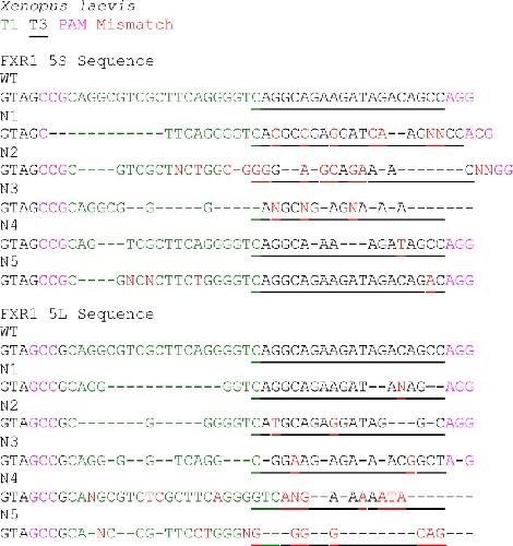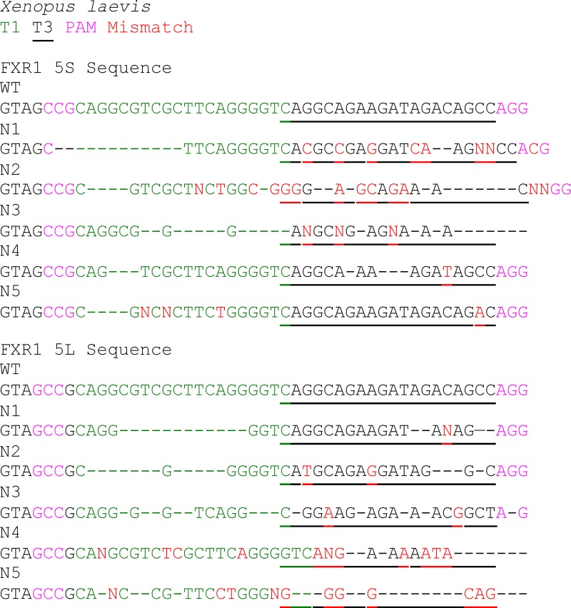 Figure S1. Sequences of fxr1 exon 15 from sgRNA-treated embryos. Sequences of fxr1.S and fxr1.L from five randomly selected X. laevis embryos injected with the sgRNA T1 (green) and T3 (underlined). sgRNA-injected embryos had deletions (dashed), uncallable nucleotides (N), and mismatches (red) compared with reference sequences. Deletions roughly correspond to 3â4 nt upstream of the protospacer adjacent motif (PAM) sequences (magenta). Fig. S1 is linked to Fig. 1, E and F. |