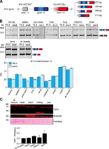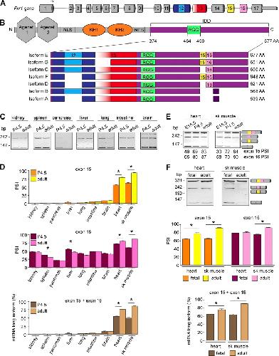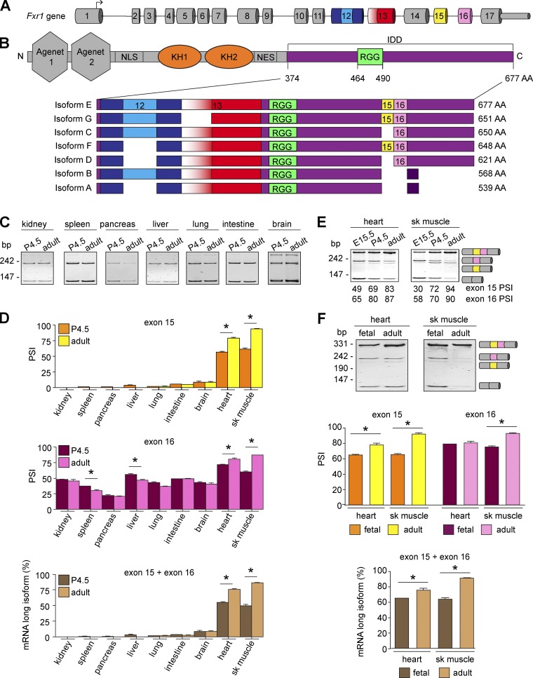 Figure 2. Alternative splicing regulates FXR1 in a tissue- and developmental stageâspecific manner. (A) Mouse Fxr1 gene structure. The arrow indicates transcription initiation site. Numbers indicate the exons. Alternatively spliced exons are indicated in colors. (B) Location of the alternatively spliced region within FXR1. Darker purple in isoforms A and B denotes different amino acids (AA). C, C-terminus; N, N-terminus; NES, nuclear export signal; NLS, nuclear localization signal. Blue, yellow, red, and pink colors correspond to the alternatively spliced exons shown in A. IDD is colored in purple, the RGG in green, and the KH domains in orange. (C and D) Splicing of exons 15 and 16 of Fxr1 pre-mRNA was evaluated by RT-PCR in nonstriated muscles of neonatal (P4.5) and adult (4-mo-old) mice (C). The PSI of exon 15 or exon 16 and the abundance of transcripts evaluated by densitometry (D). (E) Fxr1 pre-mRNA splicing was similarly evaluated in mouse skeletal muscles (sk muscle) and hearts at embryonic day 15.5 (E15.5), P4.5, and adulthood. (F) FXR1 pre-mRNA splicing was similarly evaluated in commercial human RNA samples. Data are means ± SEM, *P ⤠0.05 (one-way ANOVA test with Bonferroni correction for multiple comparisons), n = 3â4 (mouse tissues), n = 2 (fetal human tissues), n = 3 (adult human tissues). Fig. 2 is linked to Fig. S2. |
