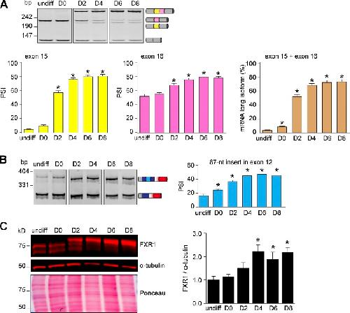 Figure 3. C2C12 cell differentiation reproduces Fxr1 splicing transitions. RNA or protein was extracted at undifferentiated stage (undiff) and differentiating (D0 to D8) C2C12 cells. (A) Splicing of exons 15 and 16 was evaluated by RT-PCRs. The PSI was determined by densitometry. (B) Inclusion or skipping of the 87-nt insert in exon 12 of Fxr1 pre-mRNA. (C) Protein lysates were analyzed by Western blotting. Data are means ± SEM, *P ⤠0.05 versus undifferentiated stage (one-way ANOVA test with Bonferroni correction), n = 3â5 experiments. Fig. 3 is linked to Fig. S3, AâE. |