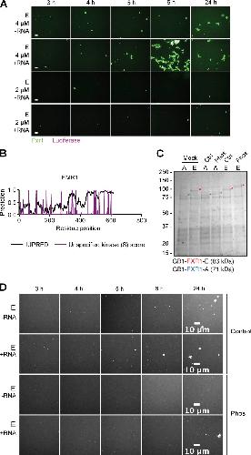 Figure S4. RNA addition and protein phosphorylation influence FXR1 aggregation in vitro. (A) Luciferase RNA accelerates isoform E aggregation. Representative images for either 4 or 2 µM isoform E with or without luciferase RNA after 3, 4, 5, 6, and 24 h. Scale bars, 10 µm. (B) FMR1 Predicted disorder (IUPRED) and unspecified kinase score for serine are marked for each aa. Predicted phosphorylated serines are uniformly distributed across the protein. (C) Coomassie staining of the in vitroâpurified FXR1 isoforms A and E. Phosphorylation (Phos) results in a band shift with respect to the control (Ctrl) or mock-treated samples. (D) Representative images of 2 µM FXR1 isoform E (shown in white) with or without RNA and with or without phosphorylation (Phos) at 3, 4, 5, 6, and 24 h. Scale bars, 10 µm. Fig. S4 is linked to Fig. 6. |