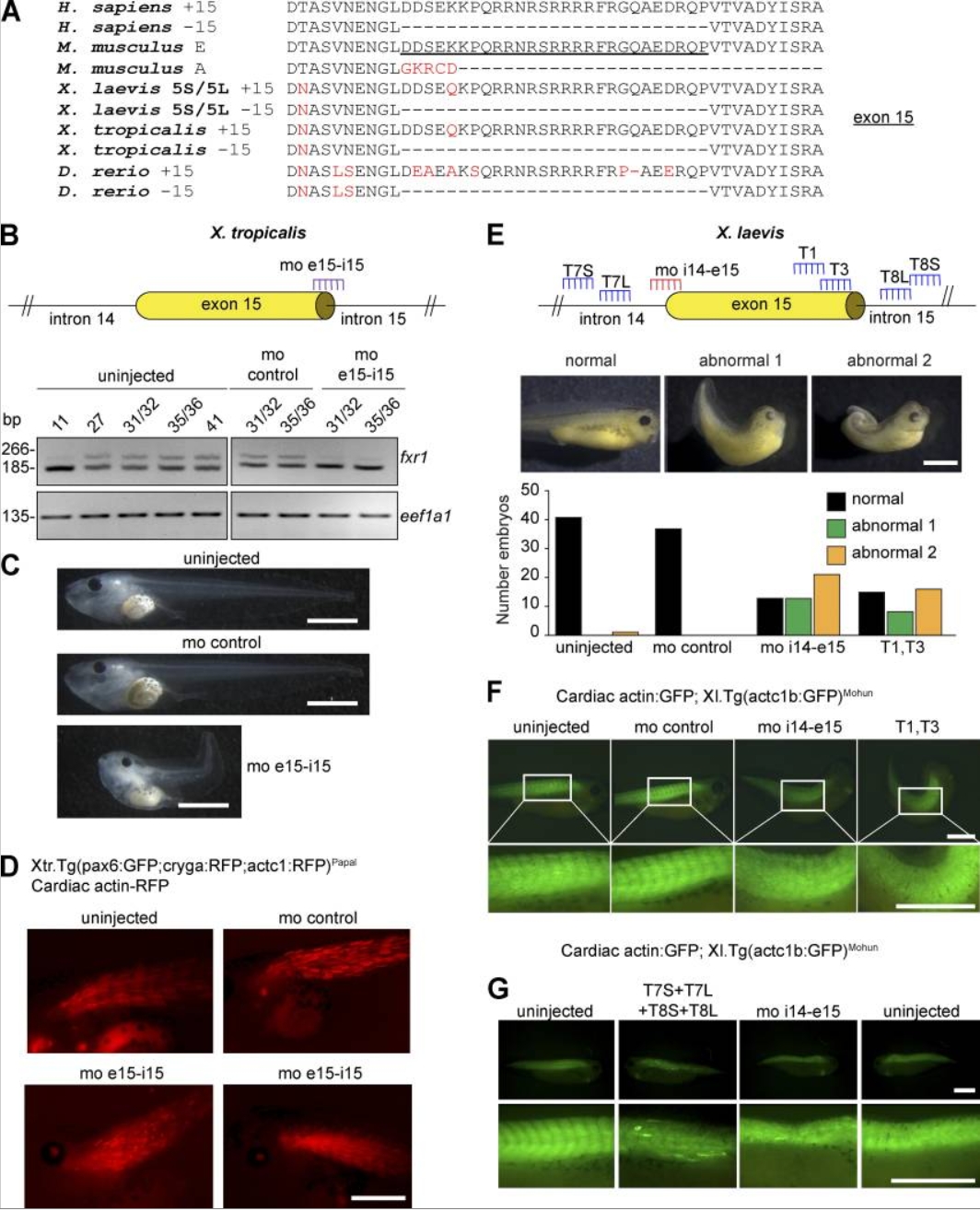 Figure 1. Splicing of fxr1 exon 15 regulates Xenopus development. (A) Conservation of FXR1 exon 15-aa sequences in human (Homo sapiens), mouse (Mus musculus), X. laevis, X. tropicalis, and zebrafish (Danio rerio). Red indicates deviation relative to mouse/human sequence. Mouse exon 15 is underlined. (B) A MO targeting exon 15 (mo-e15i15) was used in X. tropicalis. Successful blocking of exon 15 inclusion was confirmed by RT-PCR. (C) Representative images of uninjected embryos or those injected with a mo-control or the mo-e15i15 (X. tropicalis) at stage 45. (D) X. tropicalis embryos at stage 45. RFP signal marks the somites of uninjected, mo-control, or mo-e15i15âtreated embryos. (E) Position of mo-i14e15 and sgRNAs within the X. laevis genome. Representative images and quantification of normal or two abnormal phenotypes (1 and 2) for uninjected, mo-control, mo-i14e15, or sgRNA-treated embryos. (F and G) X. laevis embryos at stages 35â38. GFP signal marks the somites of uninjected, injected (mo-control or mo-i14e15), and Cas9 protein injected with sgRNAs targeting exon 15 or introns 14 and 15 for both 5S and 5L. White rectangles indicate the region of the somites magnified in the insets in (F). All scale bars, 1 mm. Fig. 1, E and F, is linked to Fig. S1. |