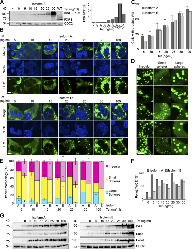 Figure 5. FXR1 phase separation is concentration dependent. (A) Whole-cell extracts from WT U2OS cells or U2OSΔFFF cells transiently transfected with either an empty vector (pAGB1139) or PCMV2xTetO2-mNeonGreen-FXR1 isoform E (pAGB1162) were prepared. Extracts were analyzed by Western blot. Right: Quantification of protein levels normalized to a loading control. (B–G) U2OΔFFF cells were transiently transfected with an empty vector (pAGB1139), PCMV2xTetO2-mNeonGreen-FXR1 isoform A (pAGB1189) or isoform E (pAGB1162). (B) Representative images of cells at increasing Tet concentrations. Scale bar, 5 µm. (C) Quantification of droplet formation for individual cells. n > 720 cells from three independent experiments. (D) Zoomed-in images showing examples of irregular droplets, small spheres, and large spheres. Scale bar, 5 µm. (E) Quantification of droplet morphology. n > 185 cells from three experiments. (F–G) The cell lysate and pellet were analyzed by Western blot as described in A. The percentage of protein in the pellet was quantified as the amount in the pellet out of the amount in the whole-cell extract. Data are means ± SEM. Supe, supernatant; WCE, whole-cell extract. |